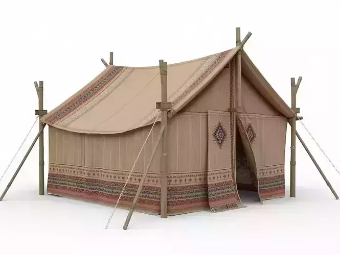 TagsTent Bedouin Traditional WovenFabric Cloth Desert Camp Shelter WoodenPoles Rope PBR Prop GameAsset Detailed 3DModel Architecture Patterned Geometric