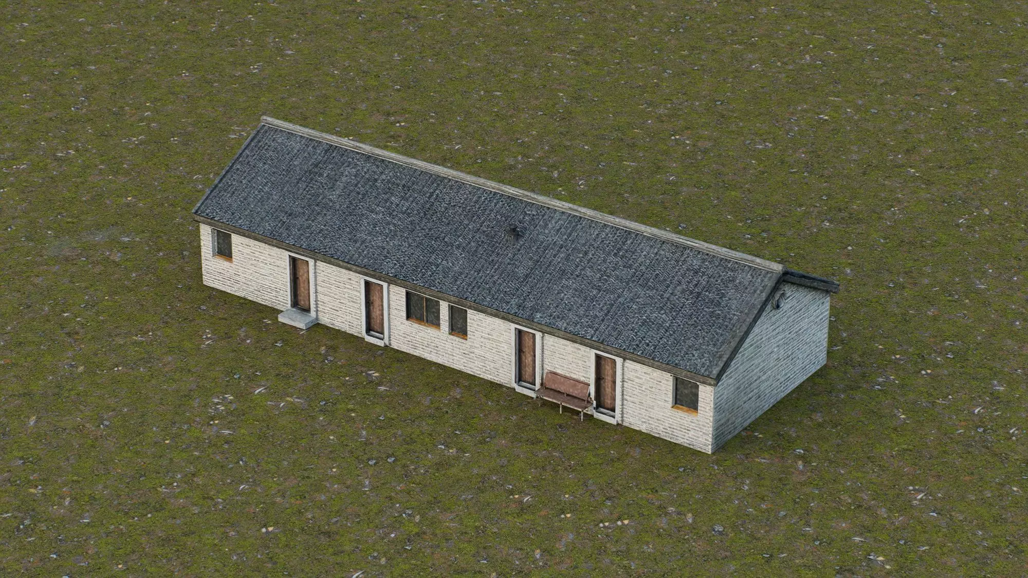 This 3D low-poly model represents a traditional Chinese rural house, reflecting the architectural style commonly found in countryside regions across China. Constructed with simple yet functional design principles, the building features a single-story structure with a gabled roof covered in dark grey tiles, typical of vernacular architecture in temperate climates. The walls are made of whitewashed brick or rammed earth, providing durability and thermal insulation. The layout includes multiple doors and windows for ventilation and natural light, while a small wooden bench placed outside suggests everyday rural life. This low-polygon model captures essential architectural details with minimal geometry, making it ideal for use in virtual environments, simulations, or digital storytelling projects focused on cultural heritage and regional landscapes.