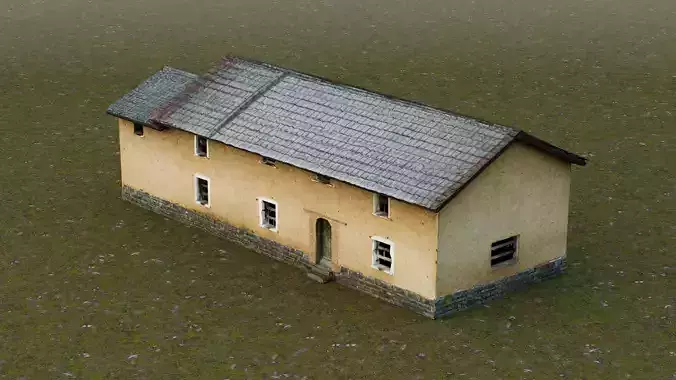 This 3D low-poly model represents a traditional Chinese rural residence, showcasing the architectural style commonly found in countryside settlements across China. The structure features a long, single-story layout with a sloped tiled roof, earthy yellow rammed-earth or mud-plastered walls, and a stone foundation. Small rectangular windows with simple frames and a central wooden door reflect practical design for ventilation and security. The model captures the essence of vernacular architecture adapted to local materials and climate conditions, emphasizing simplicity, durability, and harmony with nature. Optimized for real-time rendering, this low-poly version is ideal for use in historical simulations, video games, virtual tours, or educational content focused on traditional Chinese rural life.