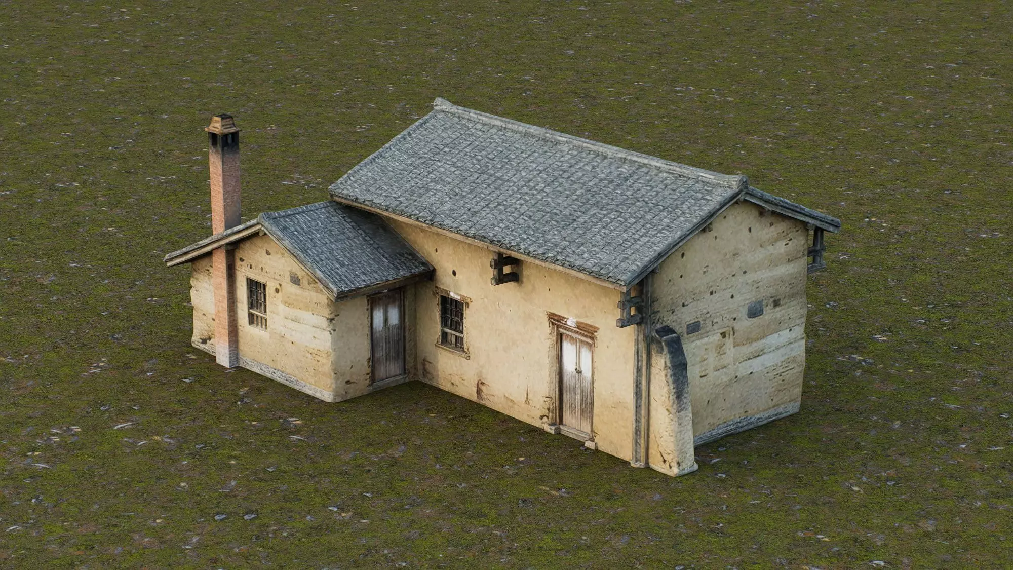 This 3D low-poly model represents a traditional rural dwelling, capturing the essence of modest countryside architecture. Constructed with weathered earthen walls and a gray tiled gabled roof, the house features a prominent brick chimney, wooden doors, and small barred windows, reflecting its functional design for agricultural communities. The model includes subtle signs of aging and wear, enhancing its authenticity and realism. Ideal for historical simulations, game environments, or architectural studies, this structure embodies the simplicity and resilience of rural residential buildings.