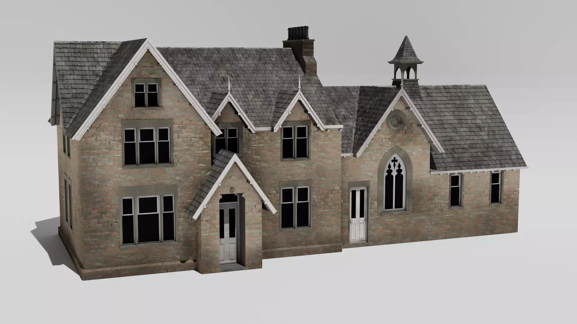 This model features a detailed brick façade, slate roof, gothic-style windows, decorative gables, chimney, and chapel-inspired architectural elements, making it perfect for historical, fantasy, medieval, or atmospheric scenes.