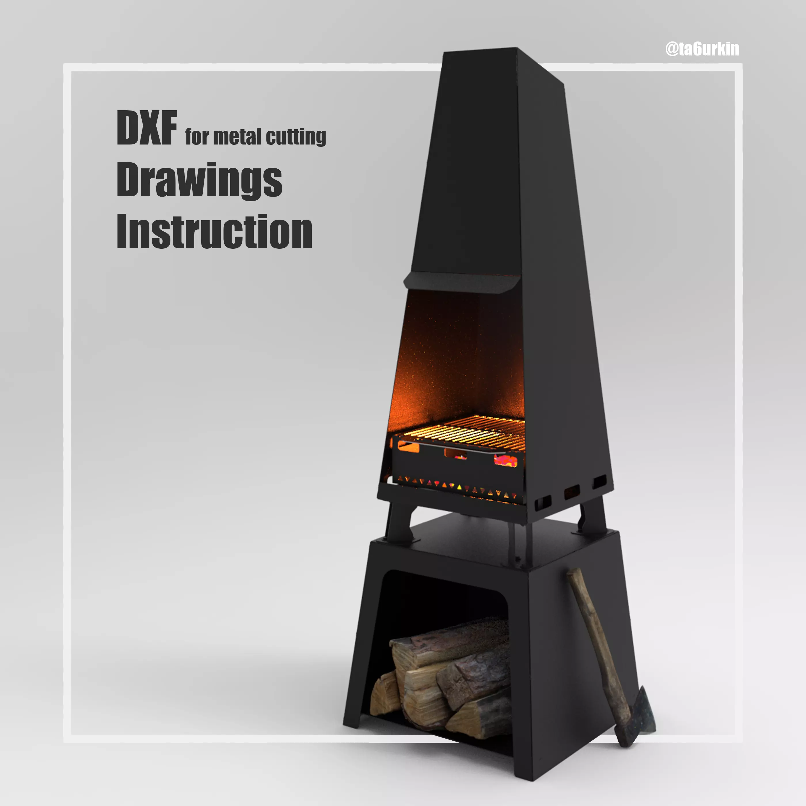 All parts are positioned among themselves “thorn-groove”. A bending machine is not needed for manufacturing. To facilitate transportation, the fire pit is disassembled into several parts. The total weight of the structure is approximately 117 kg. The following fasteners are required for assembly: DIN 933 – M8x25 (16 pcs.), DIN 934 – M8 (16 pcs.), DIN 9021 – M8 (32 pcs.). The project includes: dxf (19 pcs.), Drawings (8 pages), assembly instructions (13 pages).