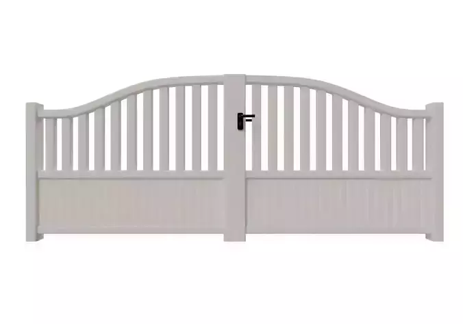 It is an arc gate for house. Dimension 300cm x 6 cm x 126 cm. The gate has several posts that create the structure. It is full on the lower part and perforated on the upper part. A lock and a handle on each sides. This gate has a white plastic material. Ideal for garden landscaping, home environment. The model is divided into different parts.