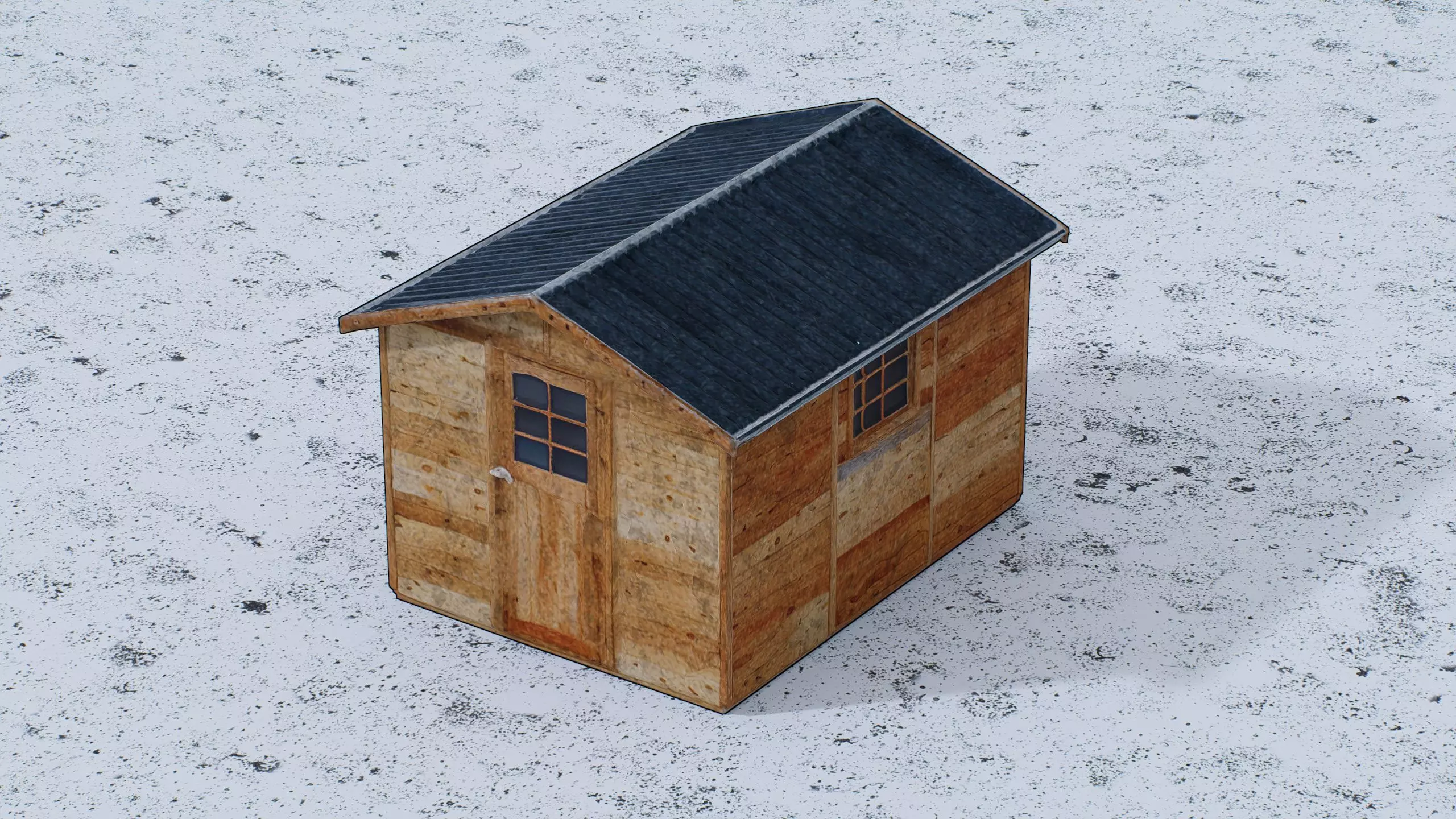 This 3D low-poly model portrays a quaint wooden cabin with a rustic charm. The structure features a sloped roof covered in dark shingles, paired with weathered wooden walls that exude a natural, aged look. Small windows and a simple door enhance its cozy, minimalist design. With subtle shadows adding depth, this model is perfect for rural landscapes, survival game settings, or architectural visualizations.