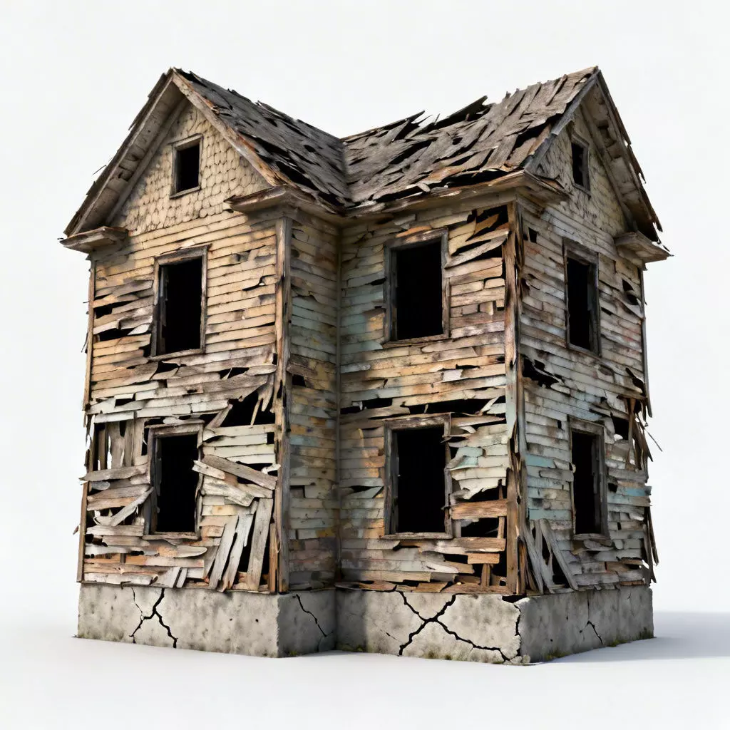 Asset BreakdownThe Overall ConceptThis asset is a highly detailed, 3D-modeled realistic American Foursquare house designed as a dilapidated and structurally compromised environmental prop. Focusing on extreme environmental storytelling through material decay and structural failure, this model features life-like scale and a heavily ravaged aesthetic, making it an ideal choice for post-apocalyptic zones, horror-themed residential levels, or as a primary landmark in realistic 3D games.