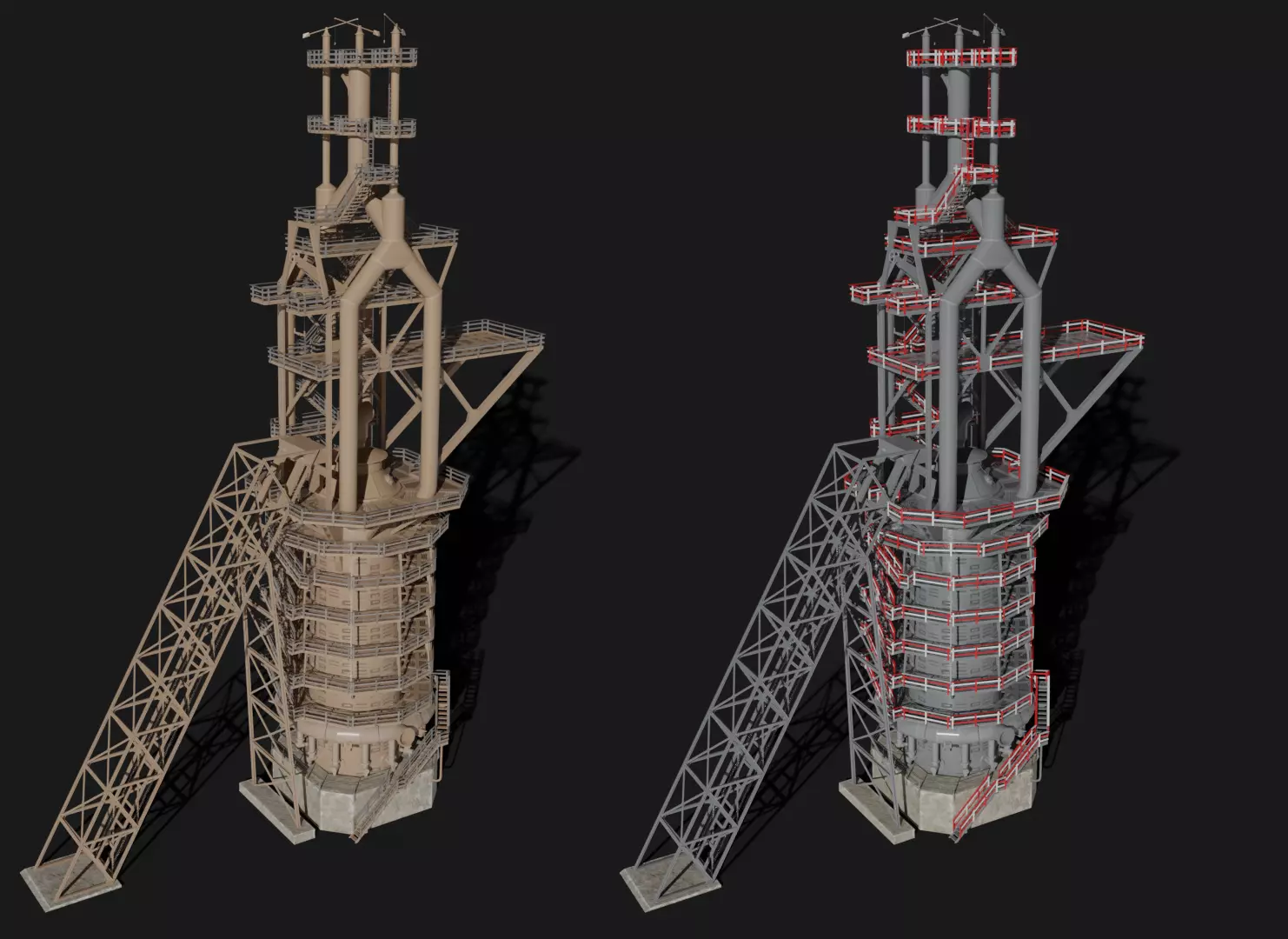This is a model of a large blast furnace, there are 2 color variants, with older more dilapidated look and a repainted version.