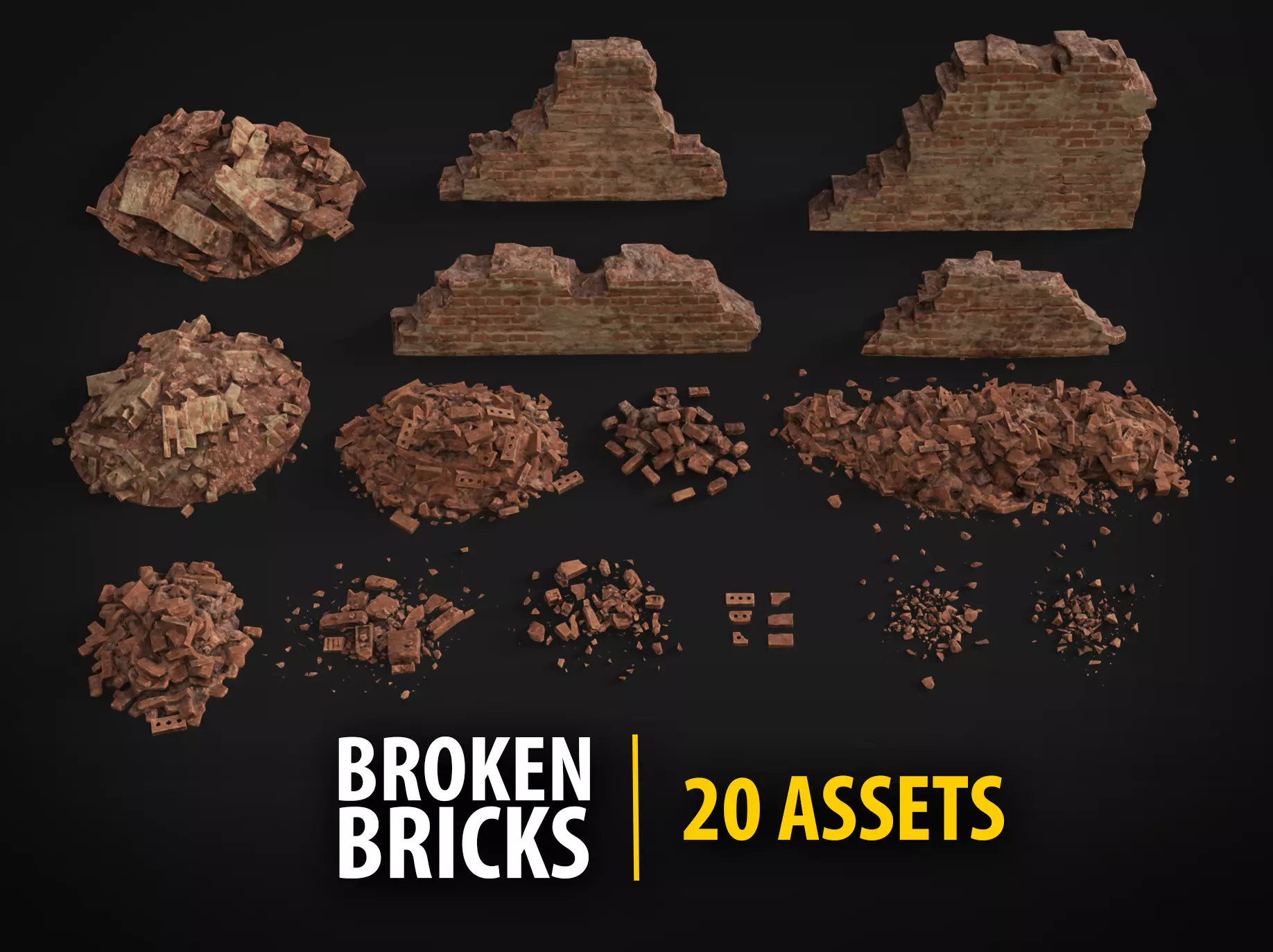 This pack includes 20 high-quality broken brick assets designed for post-apocalyptic, abandoned, or destruction scenes. You’ll find wall fragments, rubble piles, and scattered bricks that can be freely combined to create unique ruined environments.