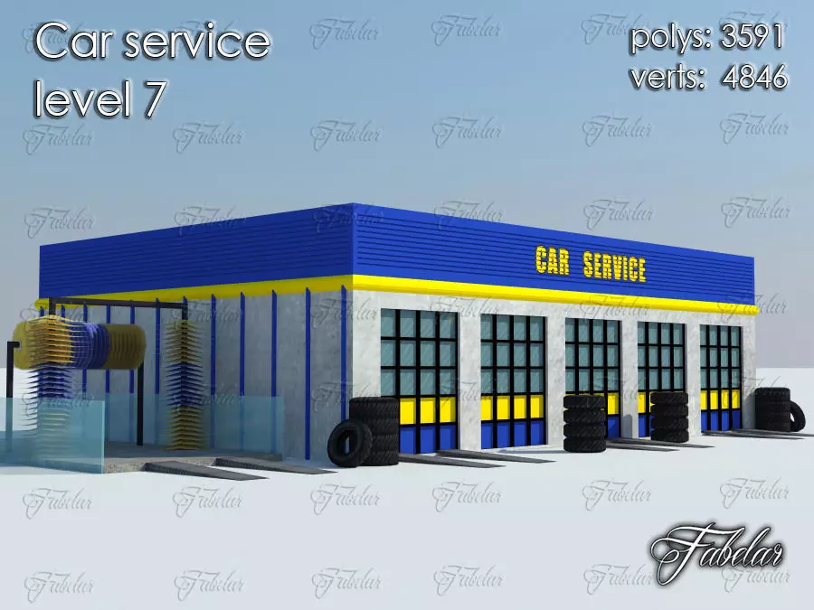 Car service level 7 lowpoly 3D model. Vray, scanline, multiple import formats.