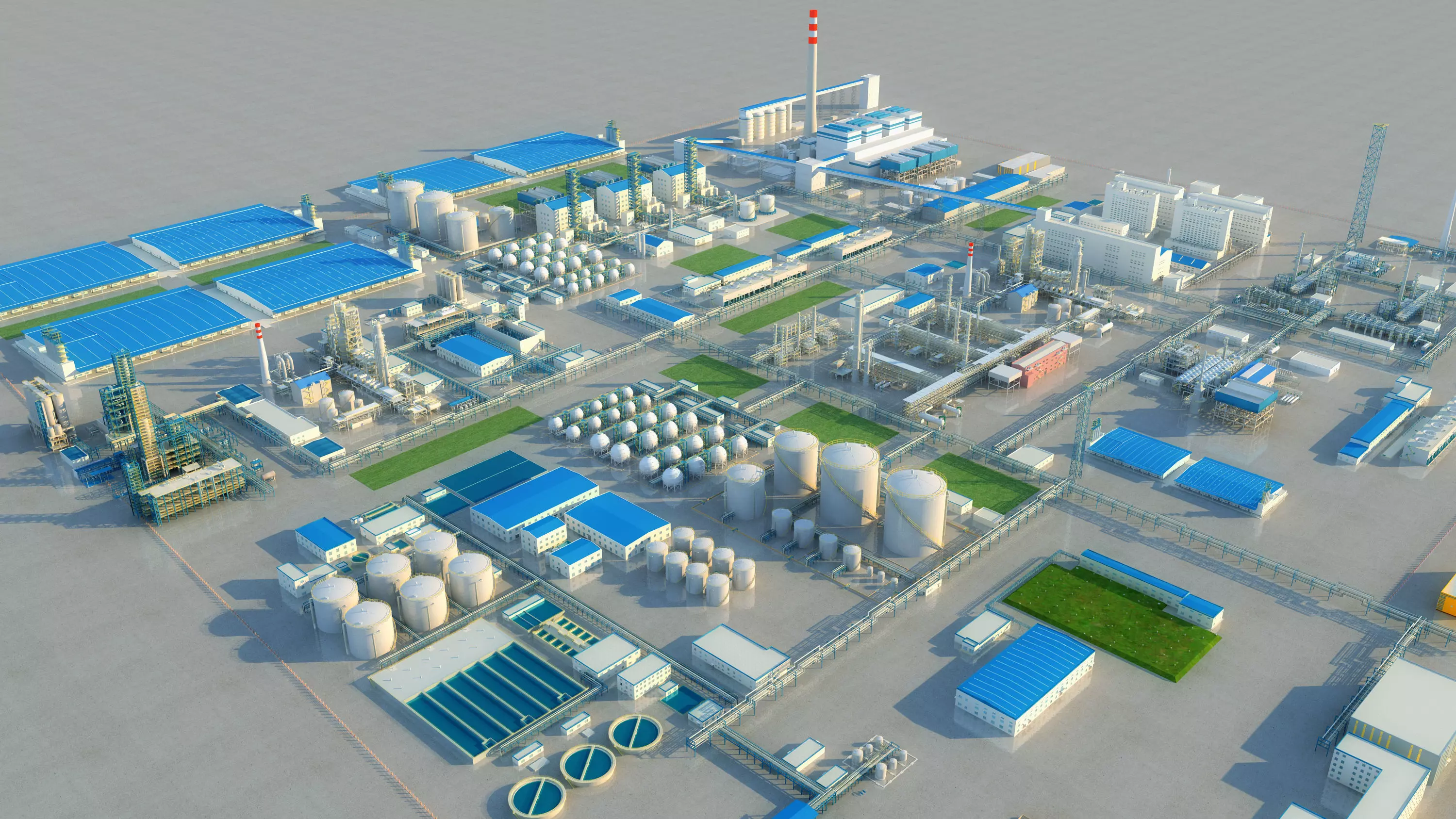 A chemical plant is an industrial production enterprise that manufactures products based on chemical raw materials and methods. Chemical plants typically consist of multiple production workshops, storage facilities, auxiliary facilities, laboratories, etc. These production workshops are usually managed in zones based on the different types of products. The products of chemical plants are widely used in various industries, including food, medicine, energy, construction, transportation, and other fields.The process flow of a chemical plant is usually adjusted according to the production process of different products. Taking fertilizer production as an example, the general process flow includes crushing and mixing raw materials, drying the materials, compressing or extruding them under pressure, and finally packaging and storing them after heating and cooling. However, production in chemical plants involves complex processes such as fine chemical reactions, plasma reactions, ion exchange, extraction and distillation, synthesis, polymerization, etc. The requirements for equipment and instruments are also more advanced.Model making software: 3ds Max 2014 Rendering software: vray3.60.03 for 3dmax2014 If you have any questions, write me: wjjmsn2020@gmail.com。