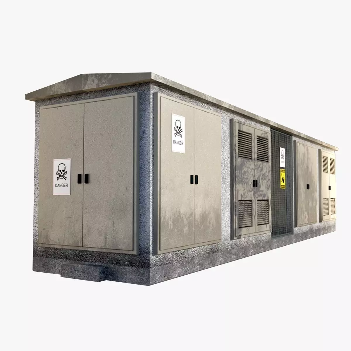 This is a transformer station for local power distribution. Concrete building metal doors and plastic handles. There is a small transformer inside the fence. Its a nice model that aged with textures.There are 2 models present, one with fences the other without fence.