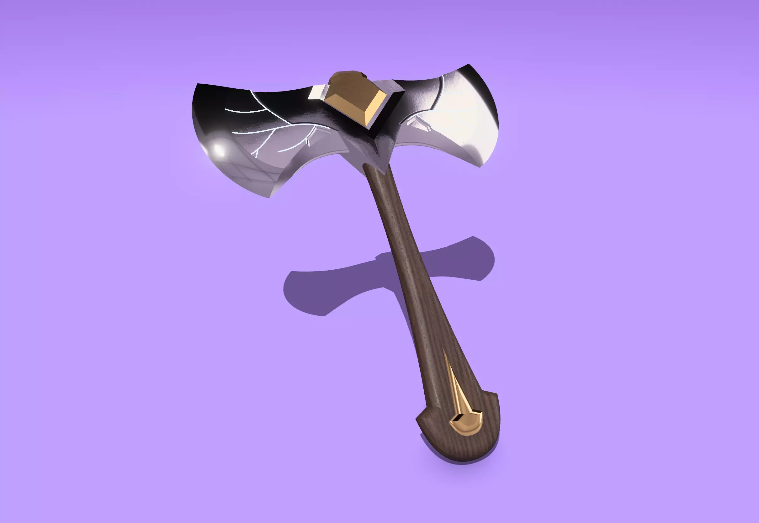 A detailed and stylized fantasy double-edge axe, designed for use in games, cinematic renders, and visual projects.This model blends realistic materials such as metal and wood with a stylized fantasy design, featuring engraved blade details and gold ornamental accents.Optimized for both real-time rendering and high-quality visualization.Technical DetailsFormats: .OBJ, .FBX.Geometry: Clean topology, triangulated meshPolycount: Approximately 5200 - 6800 tris (depending on export settings)UVs: Non-overlapping UV layout, ready for texture baking