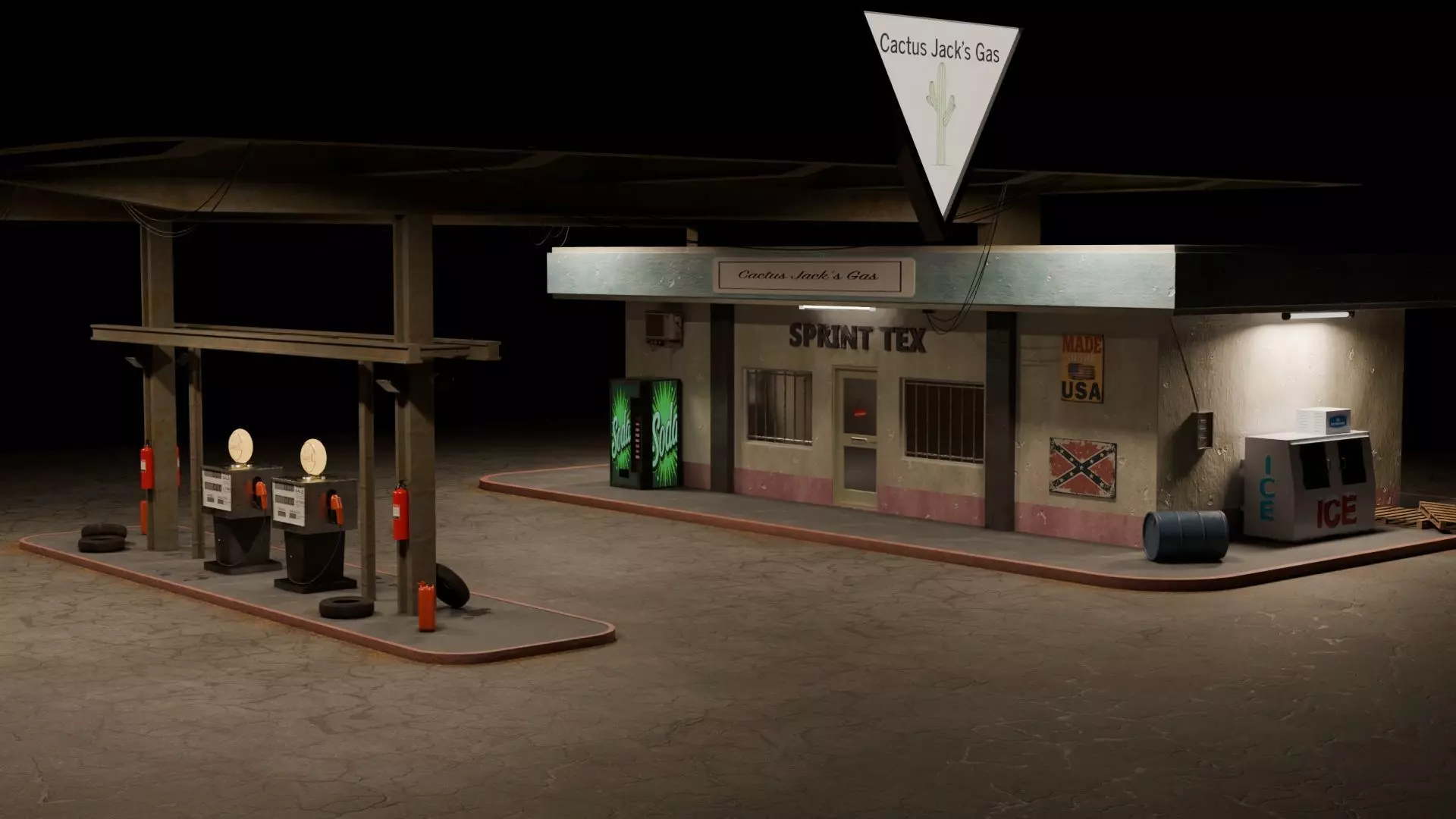 Complete gas station structure with canopy, fuel pumps, vending machine, barrels, ice box, and signage