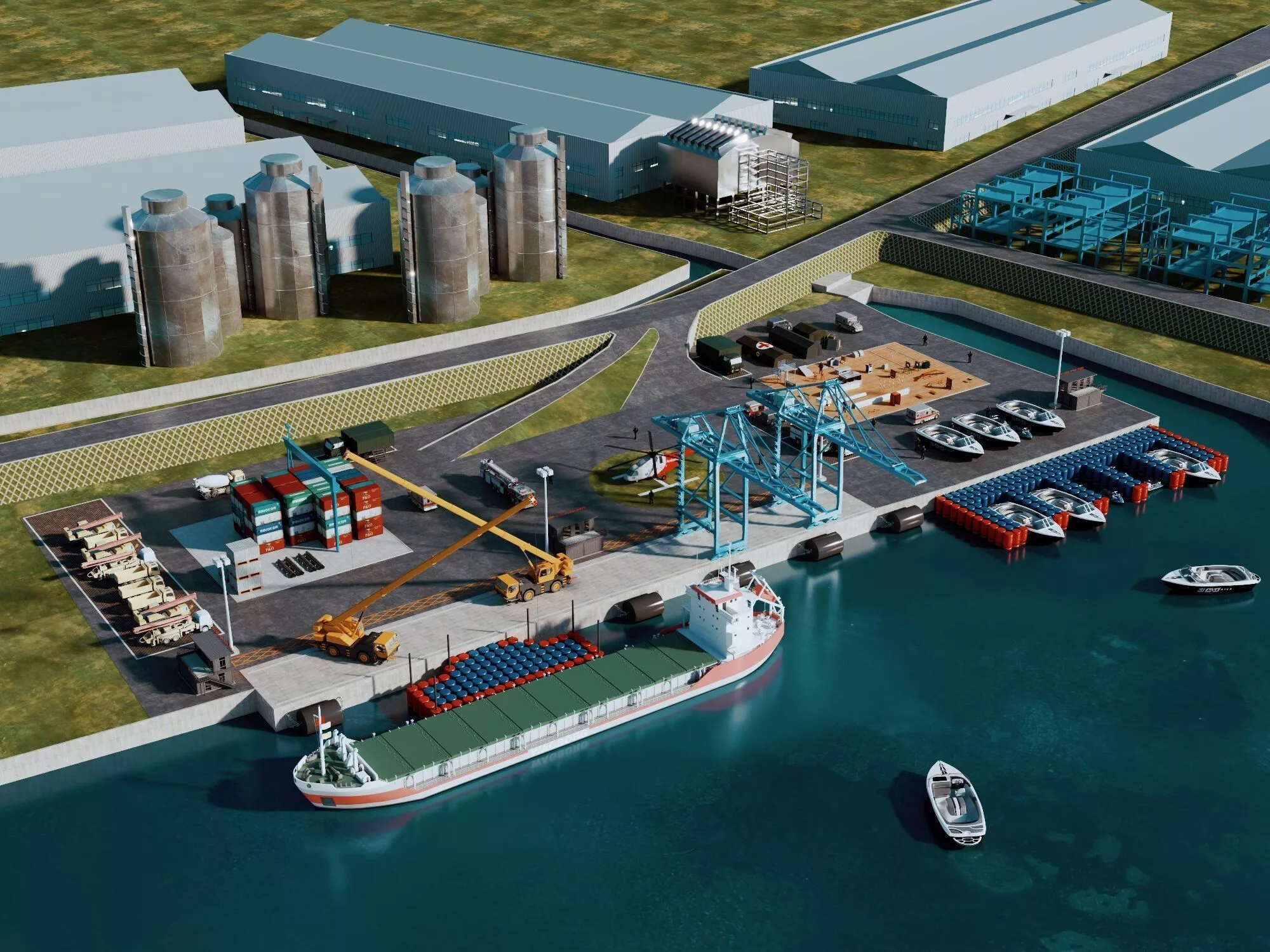 Professional high-quality 3D complete scene of an Industrial Marine Terminal and Coastal Factory meticulously crafted for large-scale maritime visualization port infrastructure planning and global logistics projects. This massive environment features a fully functional waterfront including a large cargo ship high-detail STS cranes mobile hydraulic cranes industrial silo clusters steel-structure factory buildings a dedicated helipad with helicopter and a modular speedboat pier with realistic water shaders and coastal terrain.