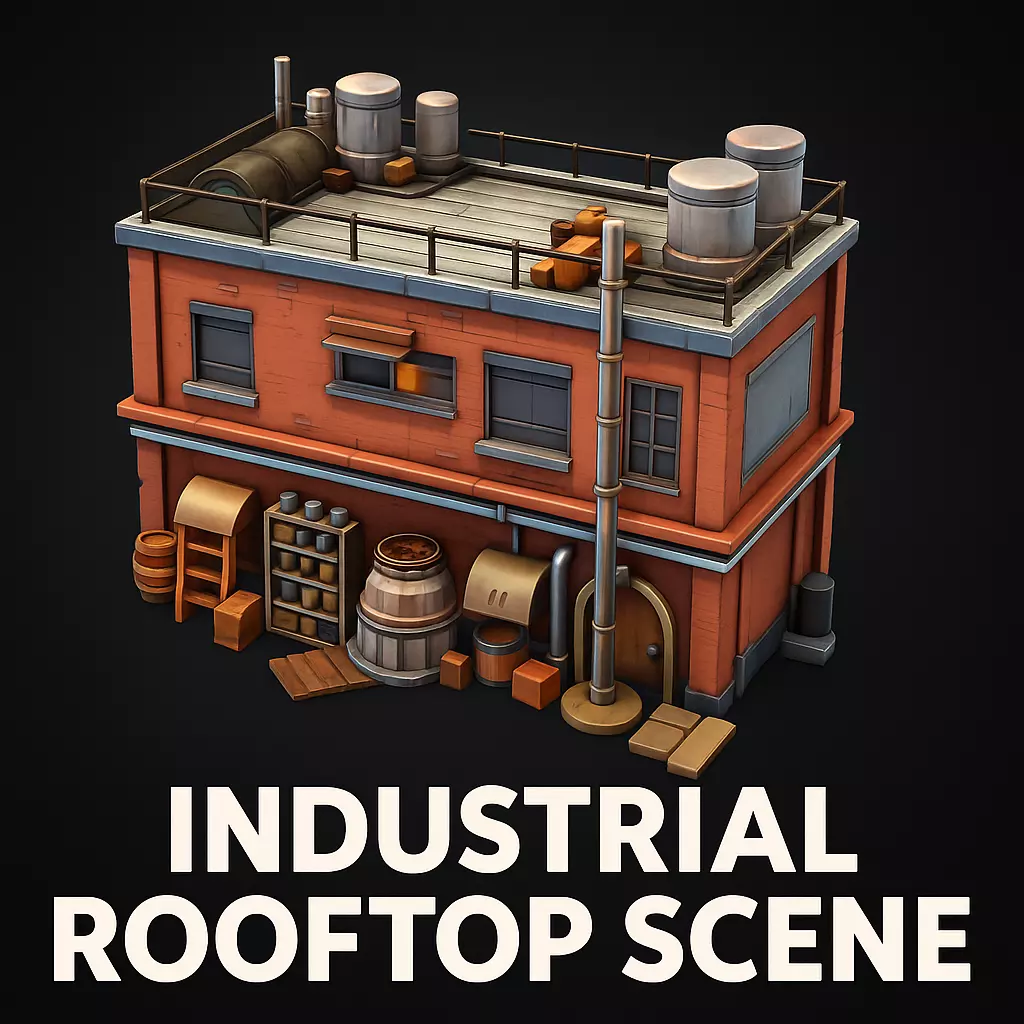 The Industrial Rooftop Scene is a high-quality stylized 3D model depicting a compact factory building filled with realistic details and handcrafted charm. Designed to capture the gritty yet functional aesthetic of an industrial district, this model features a two-story brick structure complete with rooftop machinery, metal pipes, tanks, vents, and various workshop props. Each element contributes to the sense of a living, working environment—perfect for storytelling, animation, or immersive urban backdrops.