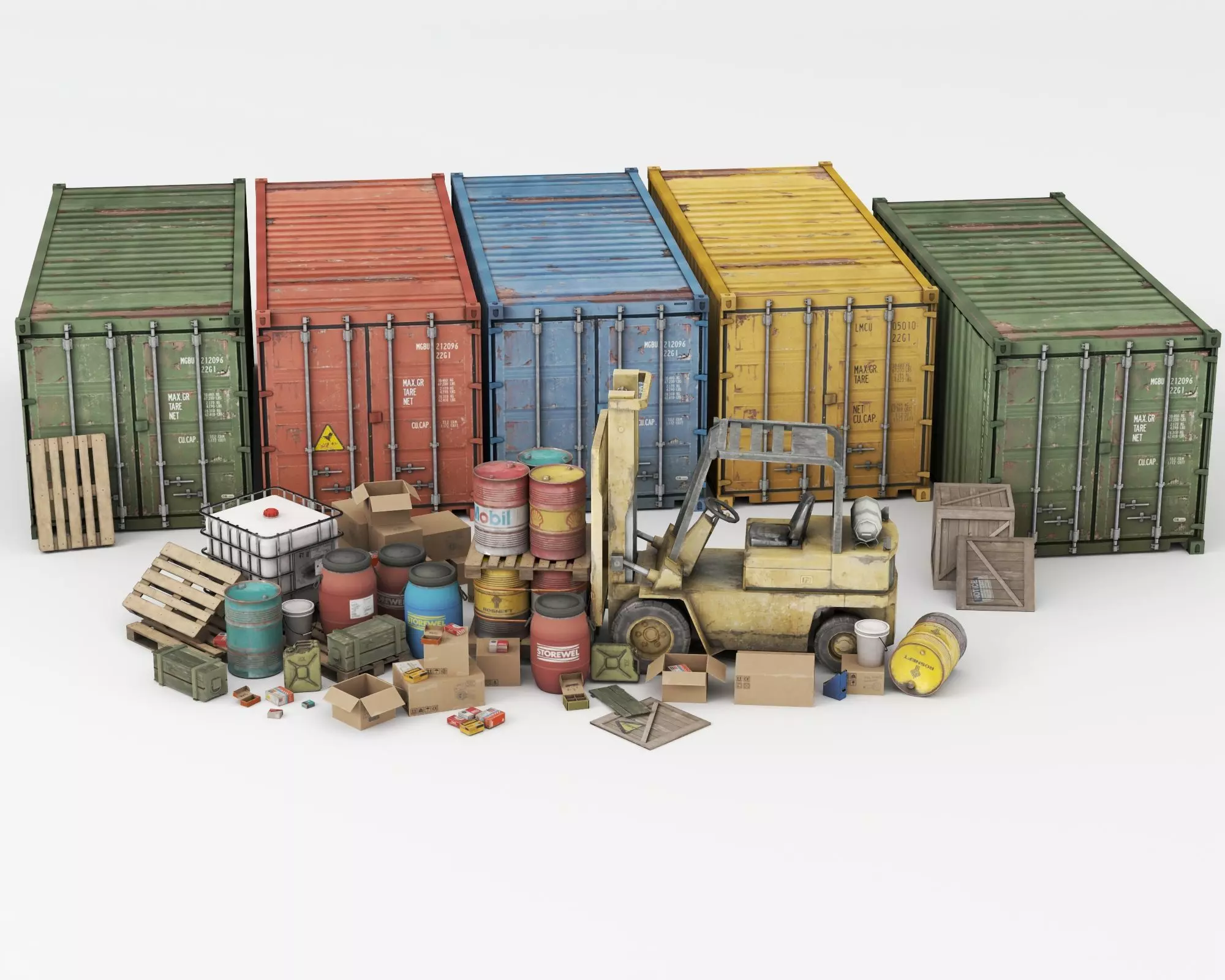 This pack includes containers, forklifts, oil drums, chemical drums, pallets, wooden crates, cardboard boxes, plastic drums, and various other goods. All props are designed with realistic proportions and detailed surface wear effects. Perfect for port, warehouse, factory, yard, and industrial environments.