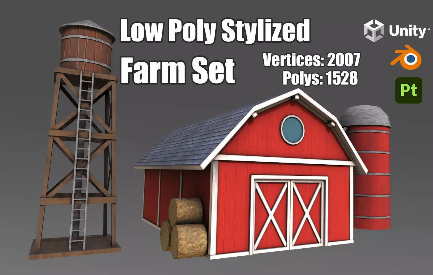 Low Poly Stylized Farm Set is a game-ready asset optimized for mobile, VR/AR, and stylized real-time environments. It includes a red barn, water tower, grain silo, and three hay bales—all using a single 2K PBR texture with baked ambient occlusion. Clean, non-overlapping UVs and efficient geometry make this set ideal for performance-focused projects.
