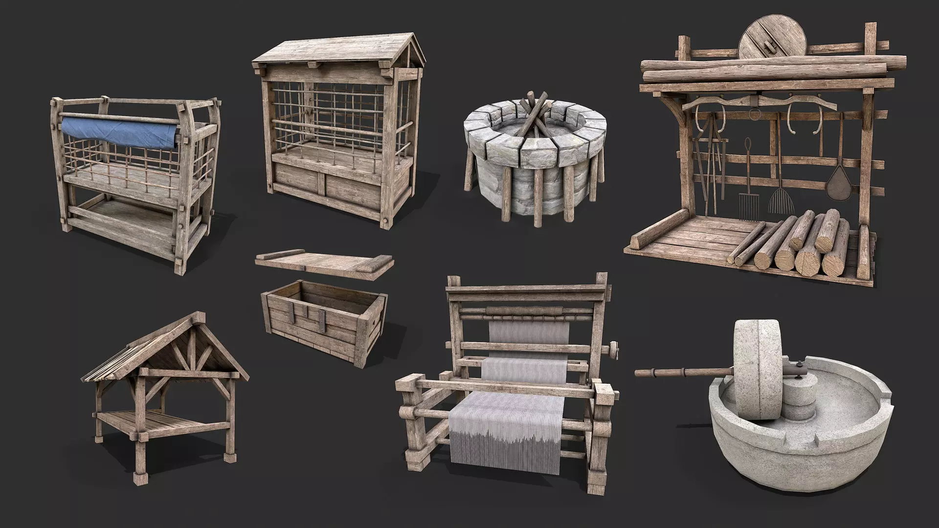The Farm Tools & Storage Pack contains medieval agricultural and storage-related assets suitable for farms, villages, and rural interiors. These models include storage structures, cages, and production tools commonly used in medieval farm life.
