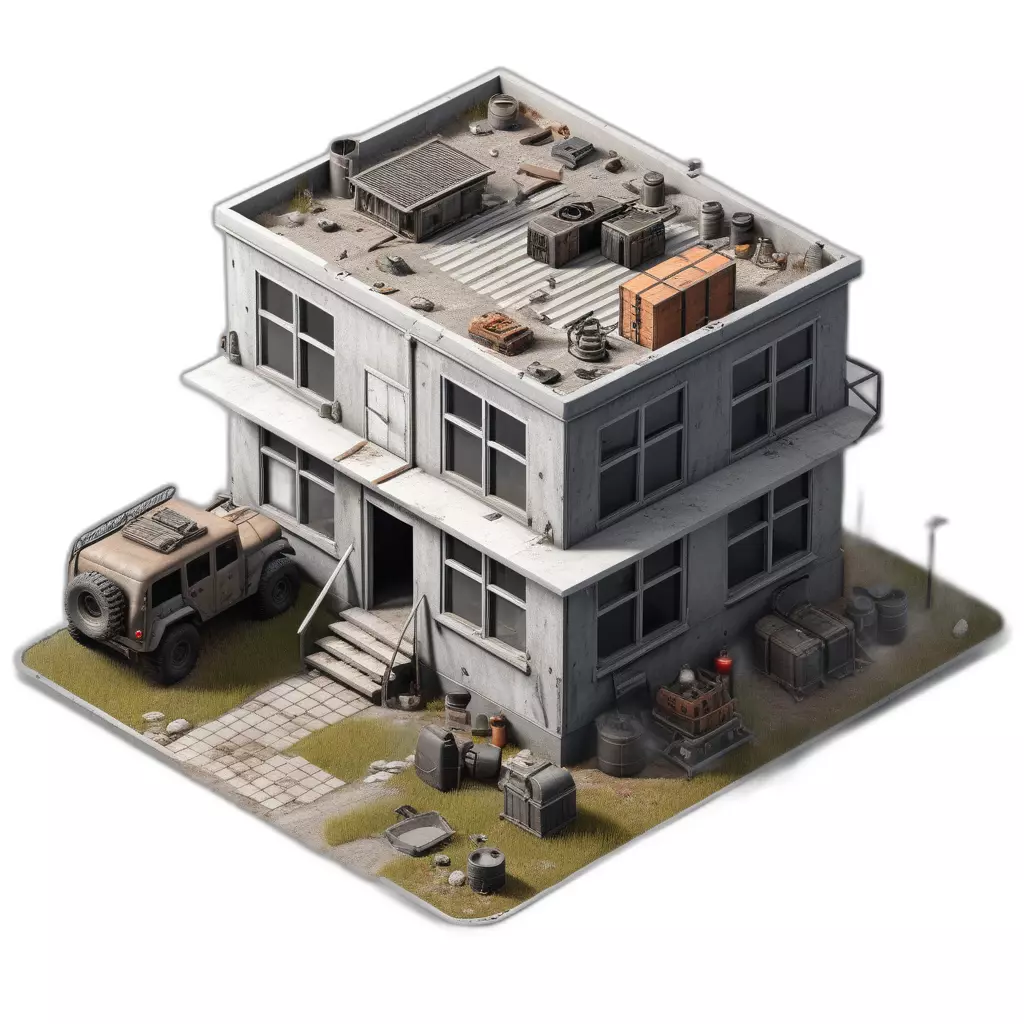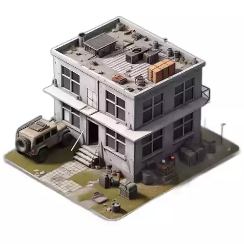 Presenting a highly detailed 3D model of a two-story military or industrial compound, envisioned as an abandoned or post-apocalyptic outpost diorama. This comprehensive scene features a weathered concrete building, complete with a flat, debris-strewn rooftop, and an exterior environment populated with numerous authentic props. Included are various crates, barrels, pipes, vents, a fire extinguisher, and other industrial clutter, alongside a rugged military-style vehicle, adding to its immersive realism. The model is meticulously crafted to serve a wide array of applications, from enriching game development projects, especially for survival, RTS, or open-world genres, to creating compelling architectural visualizations or engaging AR/VR experiences. It is also perfectly suited for high-quality digital art renders, film production, or animation projects requiring a gritty, realistic setting. The asset boasts clean topology, efficient UV unwrapping, and is accompanied by high-resolution PBR textures to ensure stunning visual fidelity. It is optimized for both real-time applications, offering a balanced polygon count for performance, and static renderings where exceptional detail is paramount. This package typically includes widely supported file formats such as GLB, FBX, OBJ, USD, DAE, and potentially others, ensuring broad compatibility across various 3D software platforms. Its modular components could allow for further customization in various digital environments.