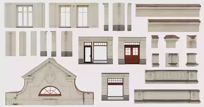 Modular building collectionFor industrial or residental buildingsOld types of designPolys: 205925Verts: 1038383Ds max version: 2020; 2021; 2023Fbx, obj, gltf, glb exported files: YesPreview images, textures, hdri and wireframe images : yes