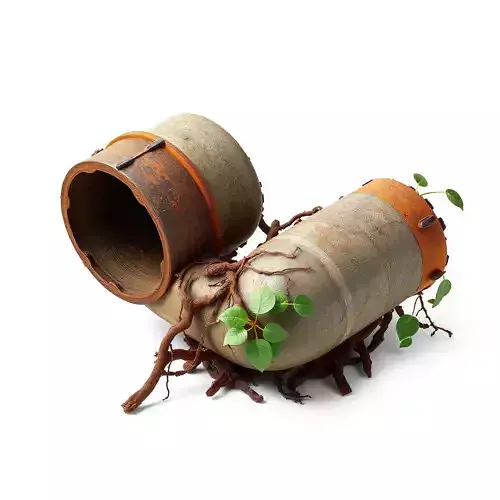 This highly detailed 3D model presents a set of rusted industrial pipe segments, artfully depicted in a state of natural reclamation. The weathered pipes, showing significant signs of corrosion and decay, are intricately intertwined with realistic roots and vibrant green foliage, creating a compelling contrast between man-made abandonment and natural resilience. The model is perfect for populating diverse digital environments, including post-apocalyptic scenes, abandoned industrial zones, overgrown ruins, or realistic outdoor settings in game development. Its clean topology and UV unwrapped meshes ensure optimal performance for real-time applications like games, augmented reality (AR), and virtual reality (VR) experiences, while also being suitable for high-quality static renderings and architectural visualizations. The asset features PBR textures for a realistic appearance under various lighting conditions, enhancing its photorealism in any scene. Supported file formats include GLB, OBJ, STL, ABC, DAE, FBX, USD, and PLY, ensuring broad compatibility across various 3D software and engines. This model is ready for immediate integration into your projects, providing a touch of authentic detail and environmental storytelling, and adding depth to your virtual worlds.