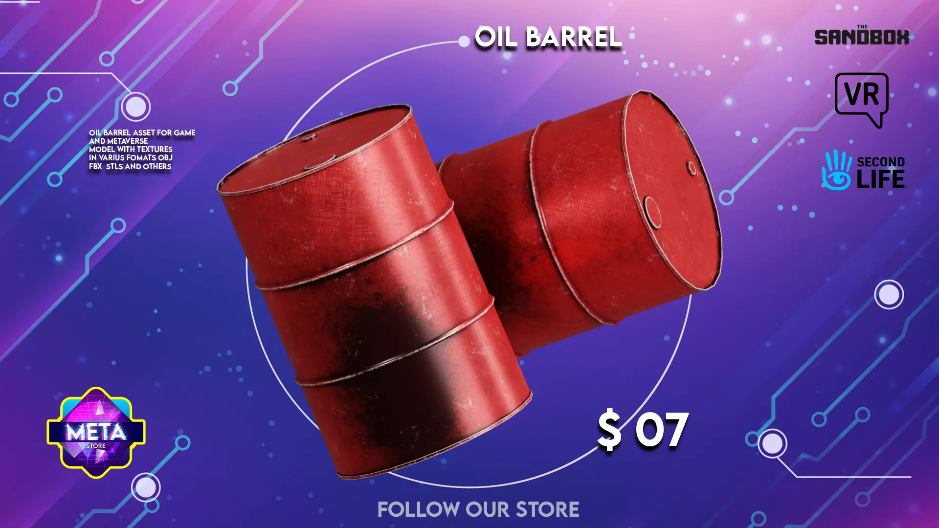 This oil barrel uses PBR Textures with a resolution of 4096x4096, these textureas are: BaseColor, Roughness, Metallic, Normal and Opacity,