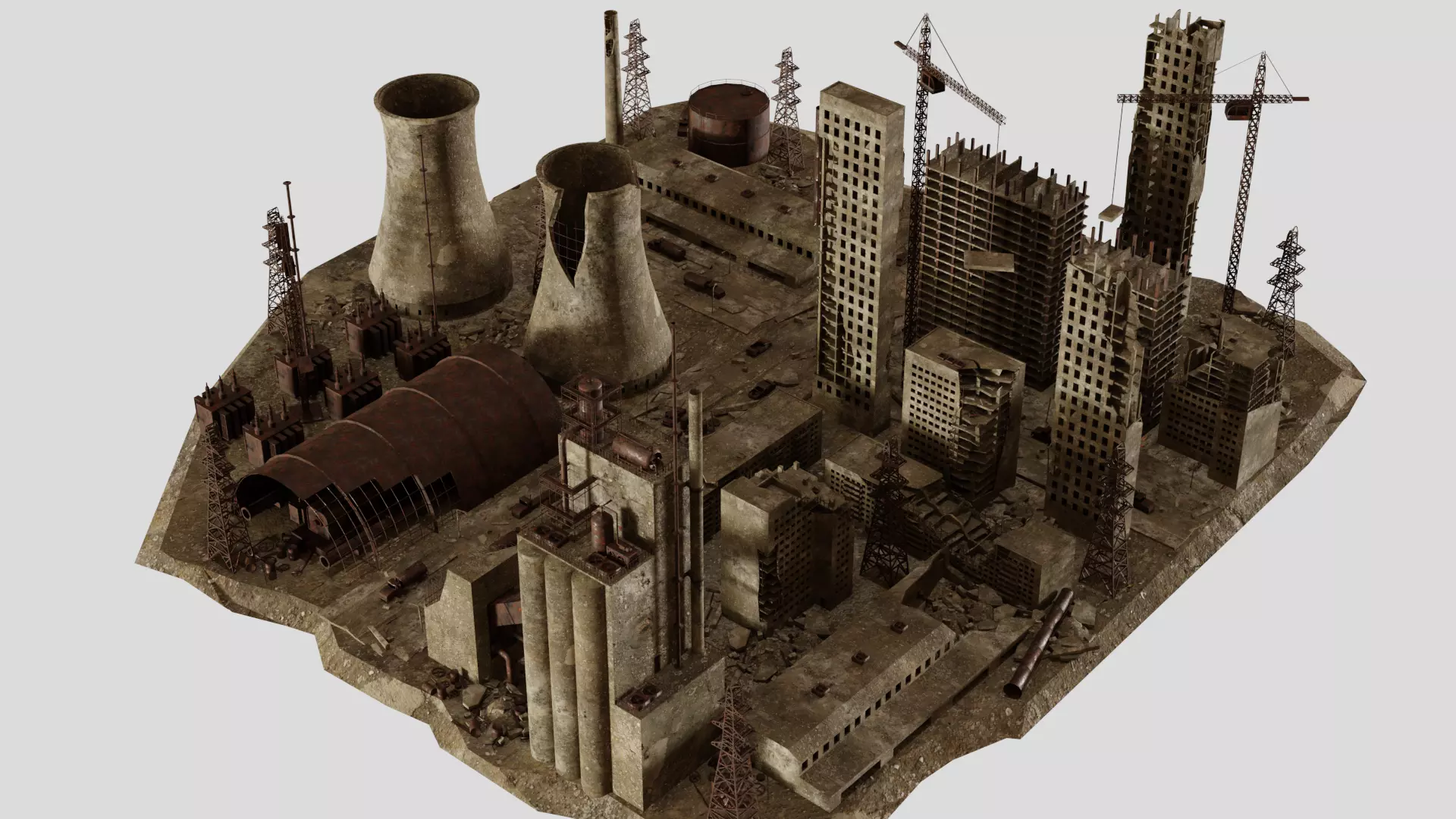 This is scene of Abandoned Post Apocalyptic destroyed factory. Designed for post nuclear themes with ruined architecture. Many details in scene. Ruined buildings, debris, cracked streets, factory elements, car wrecks etc. This package provide you for create destroyed factory and power station. You can easy shift position of buildings or copy them to create even bigger city within minutes. Very easy to modify. Every material and object is named. All materials and textures included.An example scene is included in the package. It’s readily available to import in Unity3D and UE4.Please Like and Rate! :)