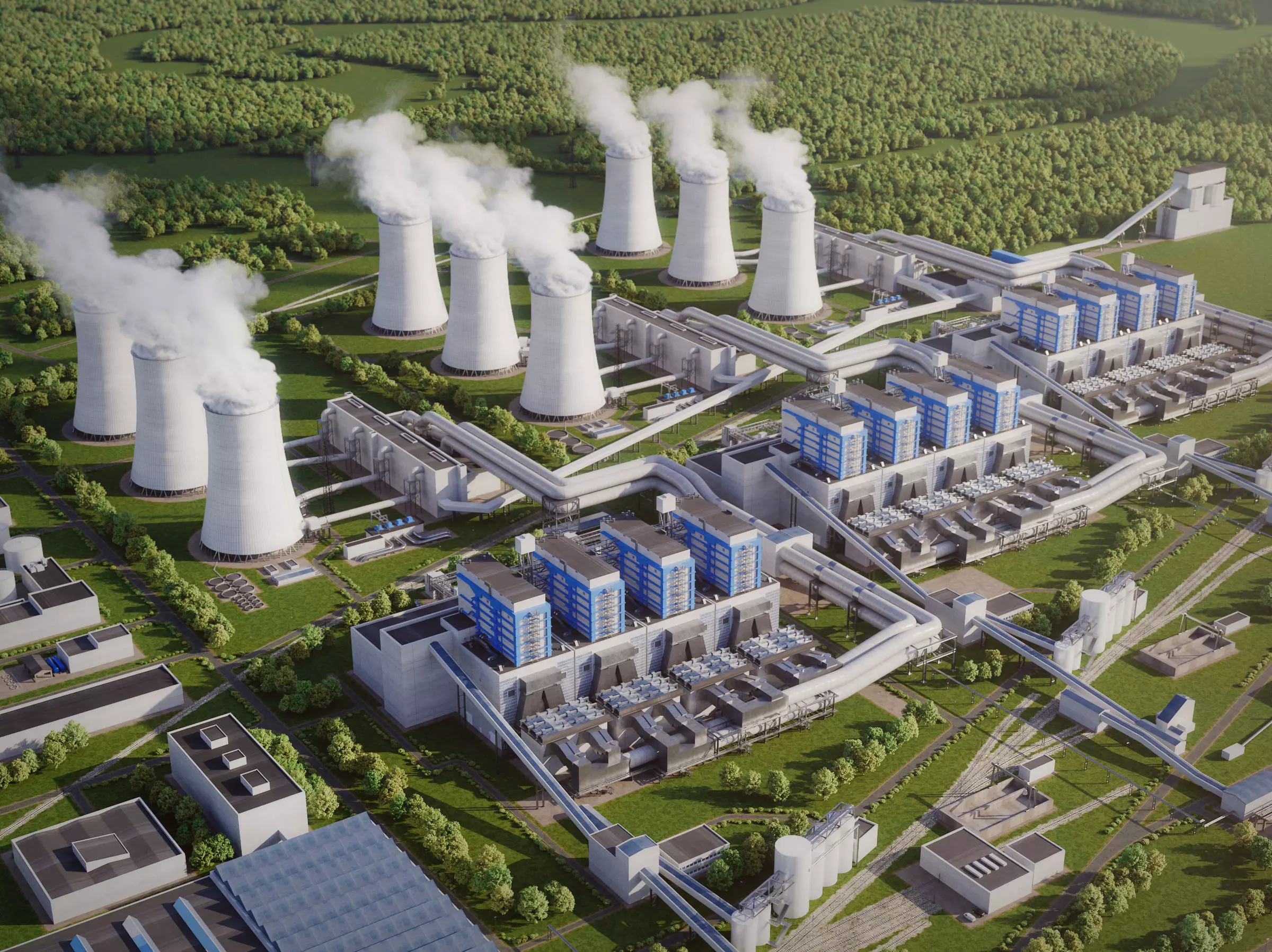 Detailed 3D model of a power plant with three power units, pipelines, and cooling towers.
