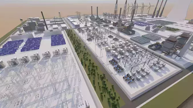 Detailed 3D model of a power plant with three power units, pipelines, and cooling towers.