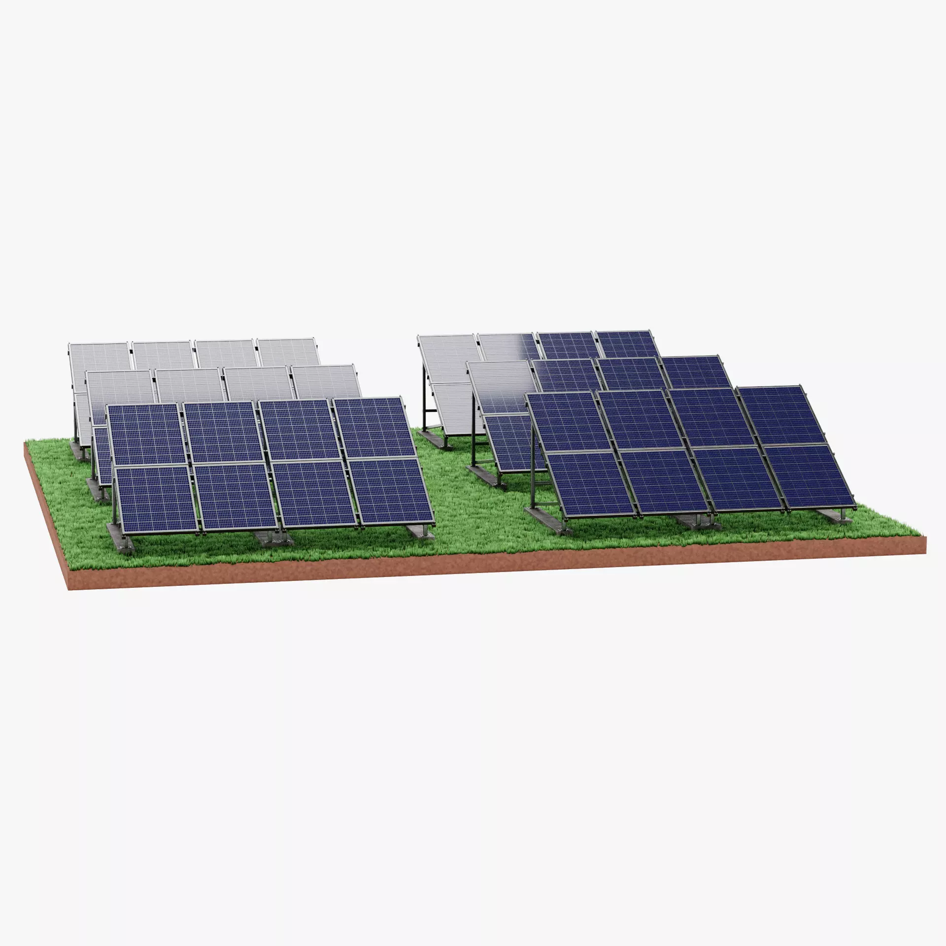 Realistic solar farm setup featuring a structured polycrystalline photovoltaic array integrated into a terrain-based environment, designed for clear and believable large-scale energy scenes. The panels are arranged in organized rows and mounted on a detailed metal framework with concrete footings, creating a stable and readable installation layout. The characteristic polycrystalline surface pattern adds visual variation across the array. The grass-covered base (grass particle system included in Blender file only) with a visible soil cross-section provides natural grounding and context within landscape or architectural visualizations. Suitable for renewable energy projects, environmental scenes, and infrastructure-focused compositions.