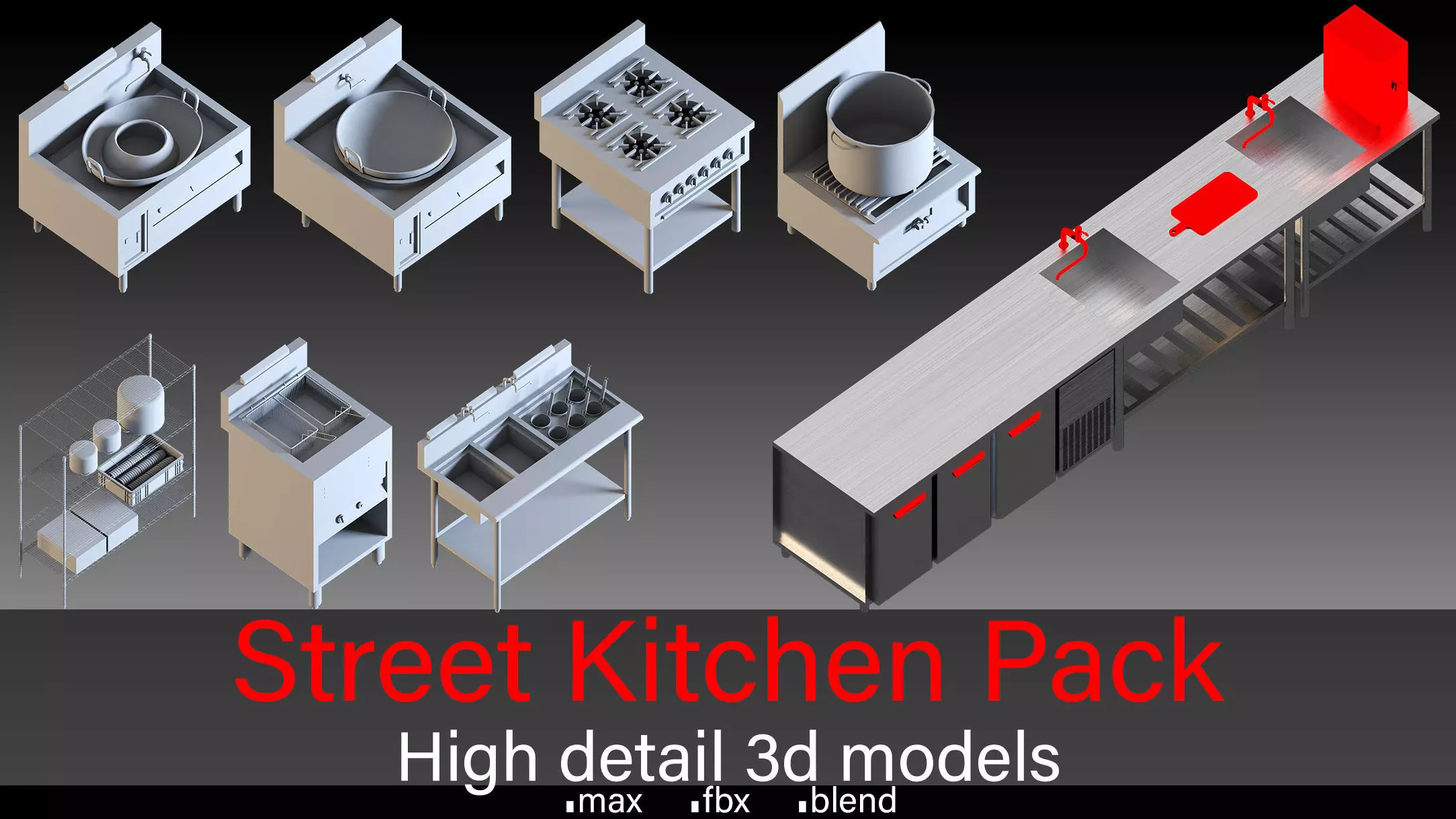 The Street Food Kitchen Pack is a collection inspired by outdoor restaurants, food stalls, and catering setups. This pack includes cooking equipment and various accessories, making it perfect for designing realistic commercial kitchens, street food scenes, and outdoor dining areas.