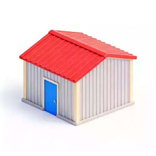 Vibrant Red Corrugated RoofThe structure is topped with a bright, saturated red corrugated gable roof. The bold color and simplified texture keep the model looking clean and illustrative, providing a high-contrast visual pop against the neutral walls.