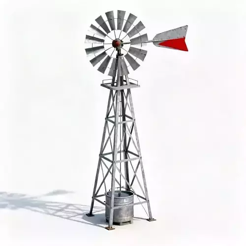 The Overall Concept This asset is a classic American-style windmill, an icon of the rural West. Unlike European mills used for grinding grain, this machine is specifically designed to pump water from deep underground wells for livestock.
