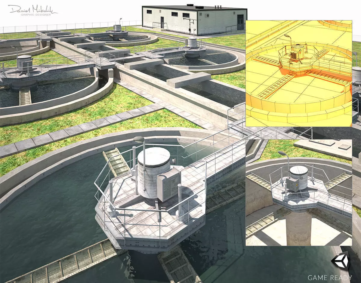 Low poly 3d mode of Water Treatment plan. Created for Unity engine with all textures.Unity package prepared with instanced object (pools and fences)Max, fbx and Unity file with animated object.Polygon counts with no duplicated models: 15000