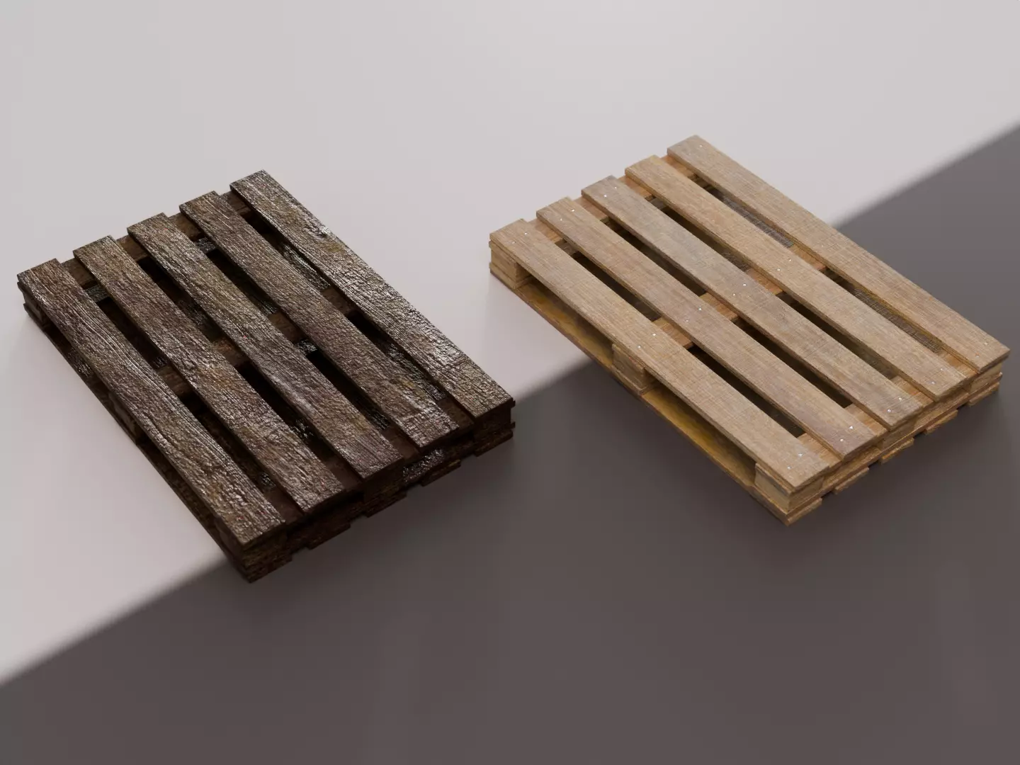 This delivery includes two wooden pallets, one new and one old and dirty. Suitable for realistic scenes.