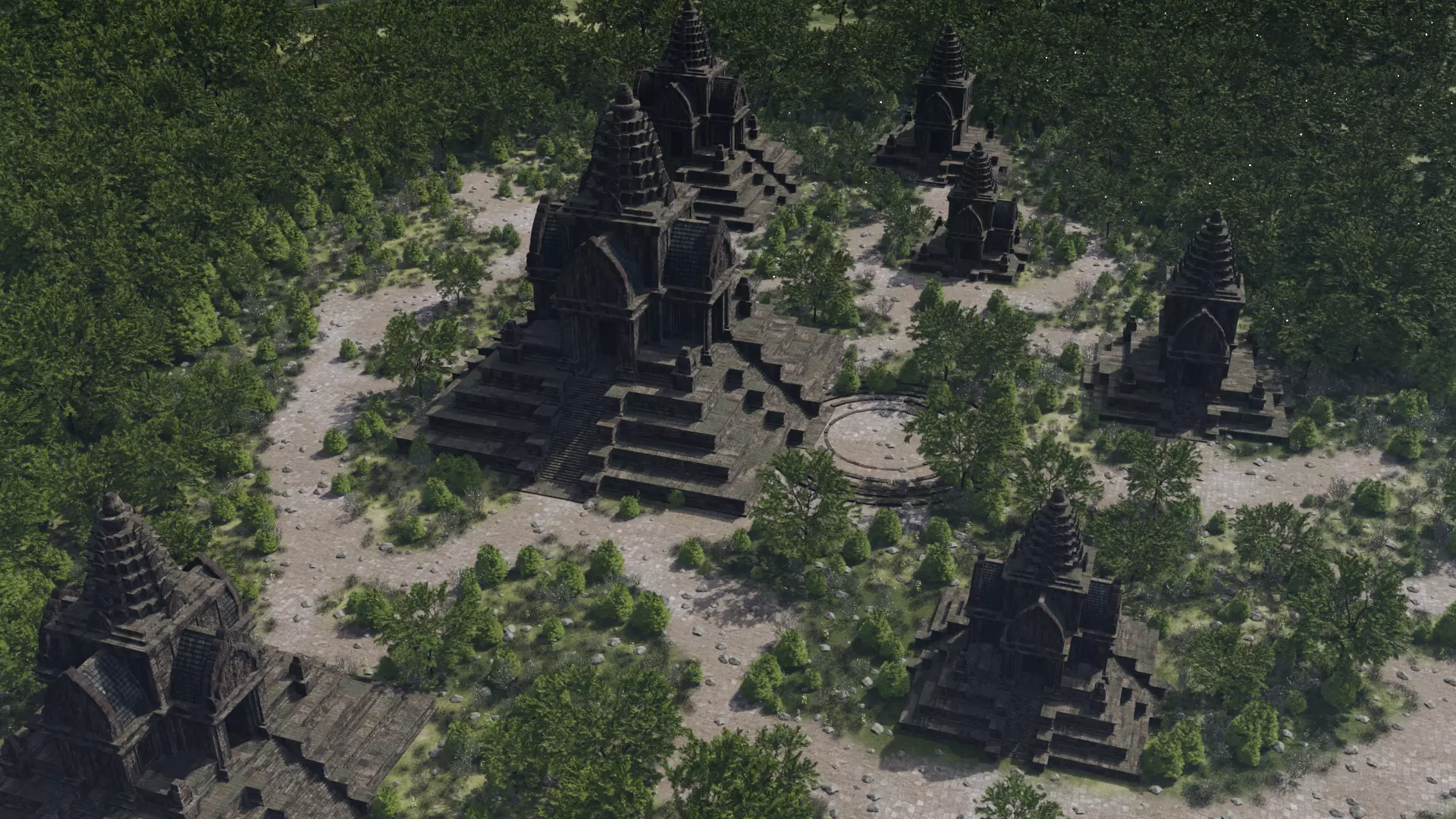 Notable assets include stone temples, paved pathways, forest trees, complemented by fine touches: stepped temple platforms, towering spires, weathered stone surfaces. Ready for game engines, real-time rendering, and enterprise AI pipelines building synthetic environment datasets.