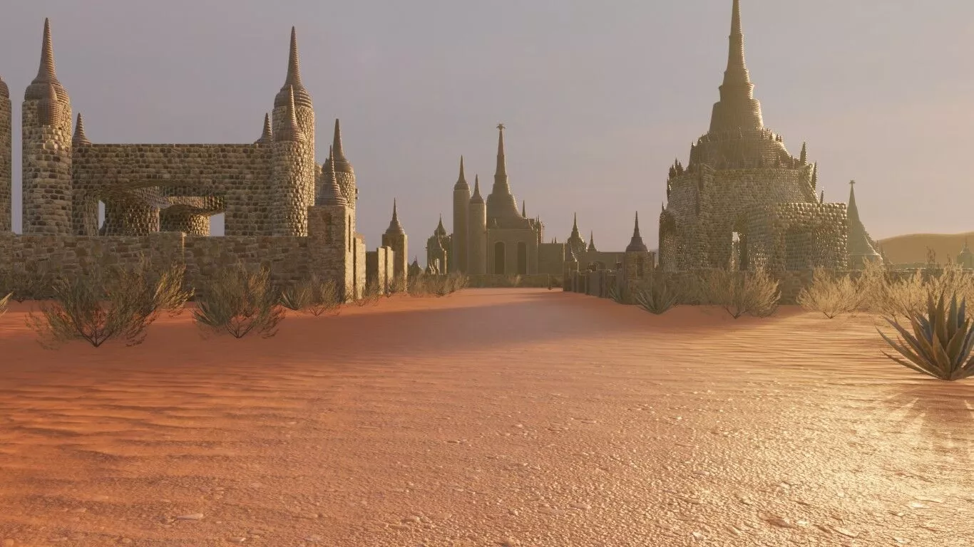 From temple complex, stone walls, spire towers, desert dunes, courtyards to fine details such as walled enclosures, ornate pagoda-like roofs, the scene is rich with visual information. A versatile 3D asset suited for game development, real-time visualization, and AI training datasets requiring diverse environment coverage.