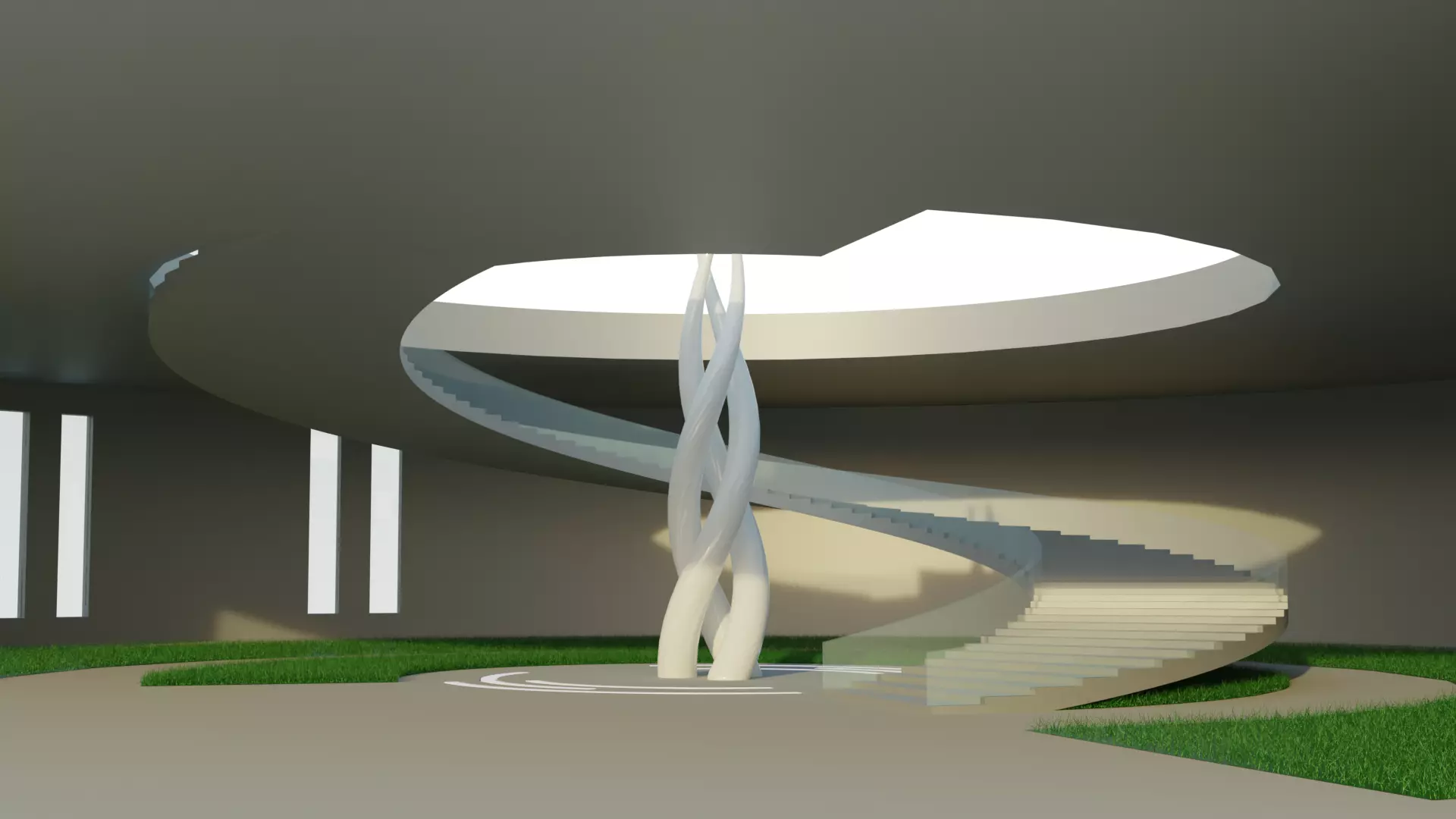 A Landscape Royal Pavilion in a round concrete form, with a circular open court in the middle including a circular stair case all the way to the top of the structure, the outdoor and indoor areas are decorated with circular plots of grass areas, a spiral twisted statue with three parts is centered in the middle oof the building, the form structure could be easily melted with nature and environmentally friendly designed, the model was created using computational parametric tools to achieve the most accurate geometry with clean details, it could be used for architectural render purposes outdoors, and also for Landscaping, urban landmarks and a usable pedestrians open air structure that could host various activities and multipurpose activities.