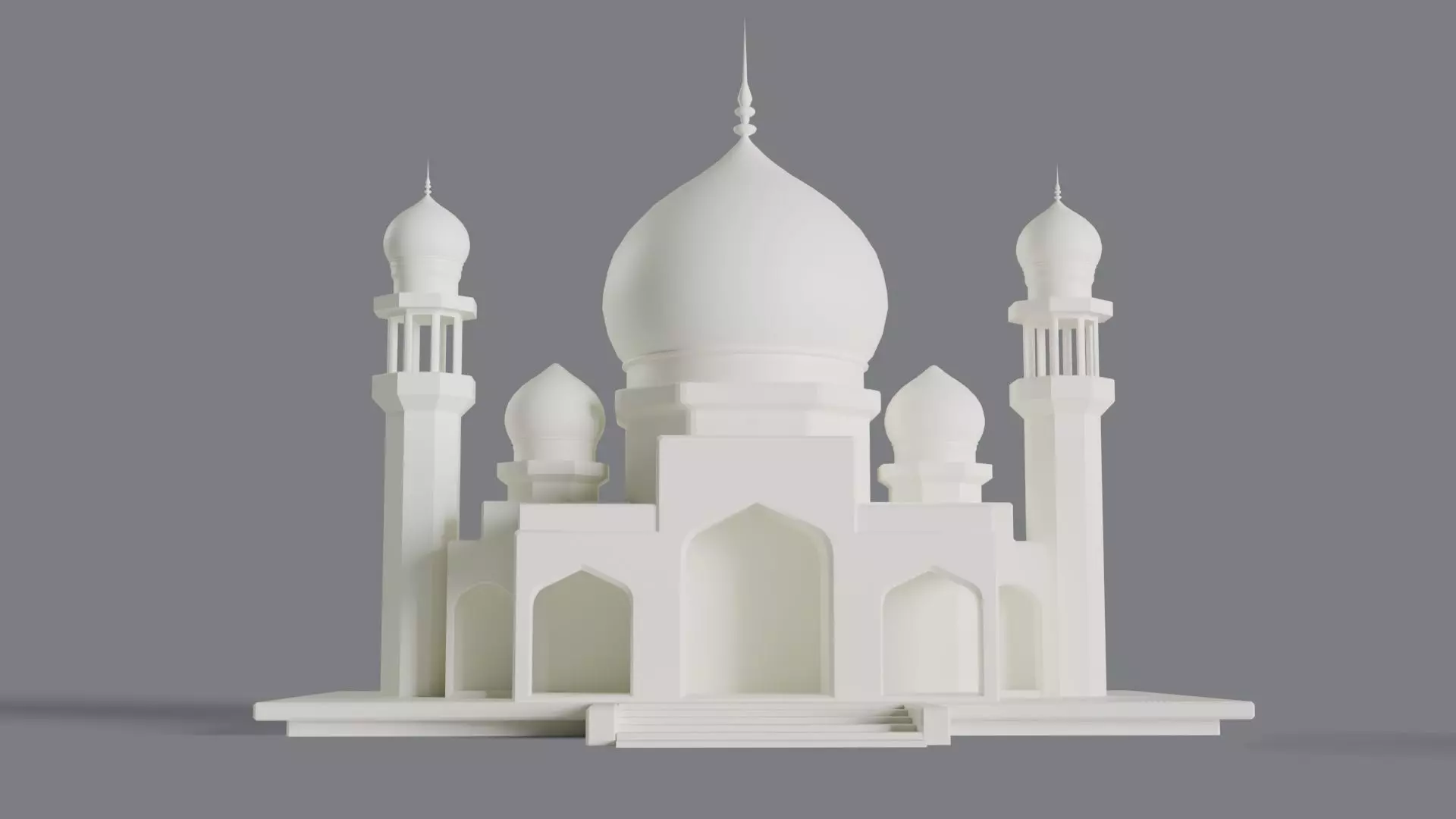 “5 Domes Masjid” is a clean and elegant 3D architectural model inspired by traditional Islamic mosque design. The structure features a large central dome surrounded by four smaller domes, complemented by four tall, symmetrical minarets. The balanced proportions and smooth surfaces create a refined and timeless aesthetic suitable for a variety of projects.