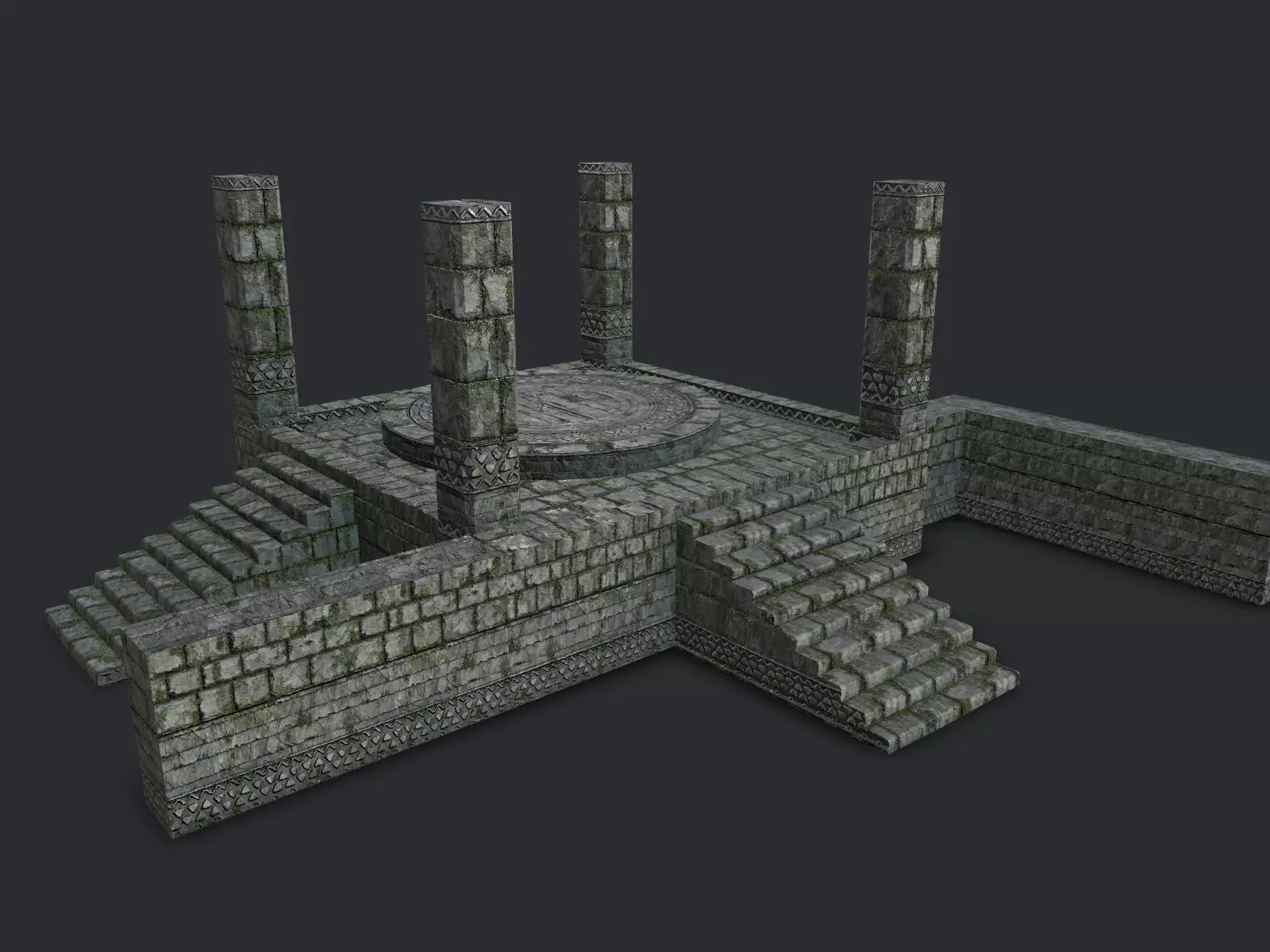 Six unique meshes:altar_wall (28 tris)altar_pillar (92 tris)altar_stairs (275 tris)altar_ring (224 tris)altar (272tris)floor (32 tris)
