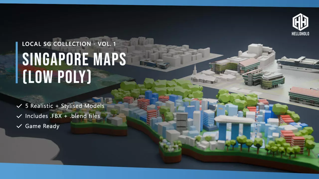 This set includes 5 high-quality game ready models, featuring the Singapore map in 3 different styles (low-poly stylised, realistic, and minimalist) and 2 school building models.