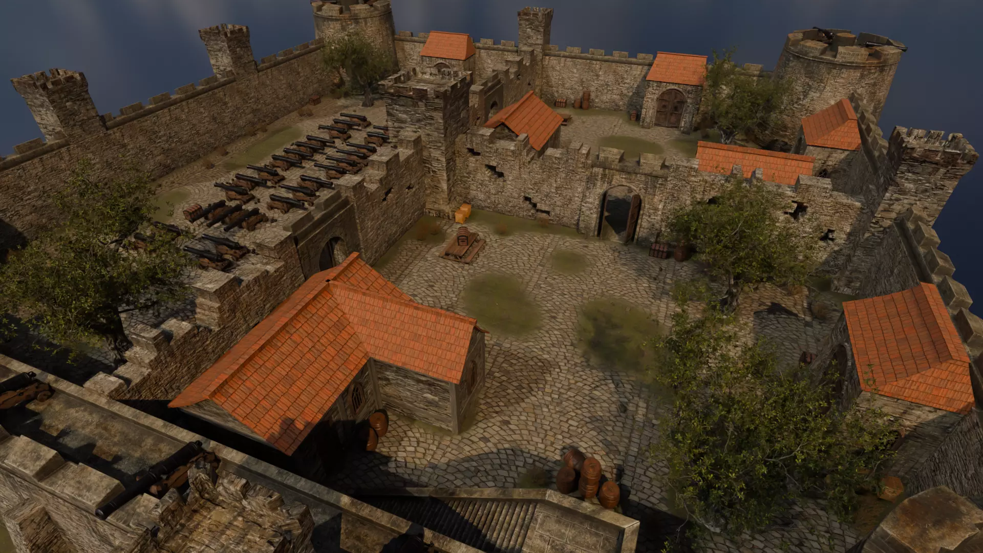 Notable assets include Castle walls, Courtyard, Round towers, complemented by fine touches: Crenellated battlements, Open gate doors, Cannons with cannonballs. Well-suited for historical game levels, heritage visualization projects, and synthetic AI datasets covering pre-modern environments.