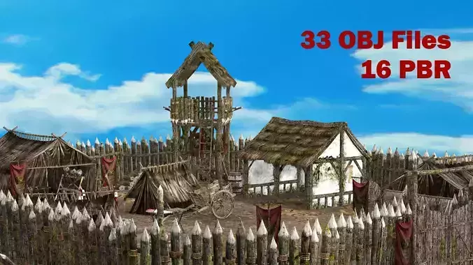 Medieval Top-Down Barbarian Camp Low Poly 3D Model is Here you can find a lot of different elements of tribal architecture and few pregathered elements. Package keeps full PBR sets of 4096x4096 textures for each material.Triangle count for elements between 32 tris for smaller element and 2370 tris for bigest.