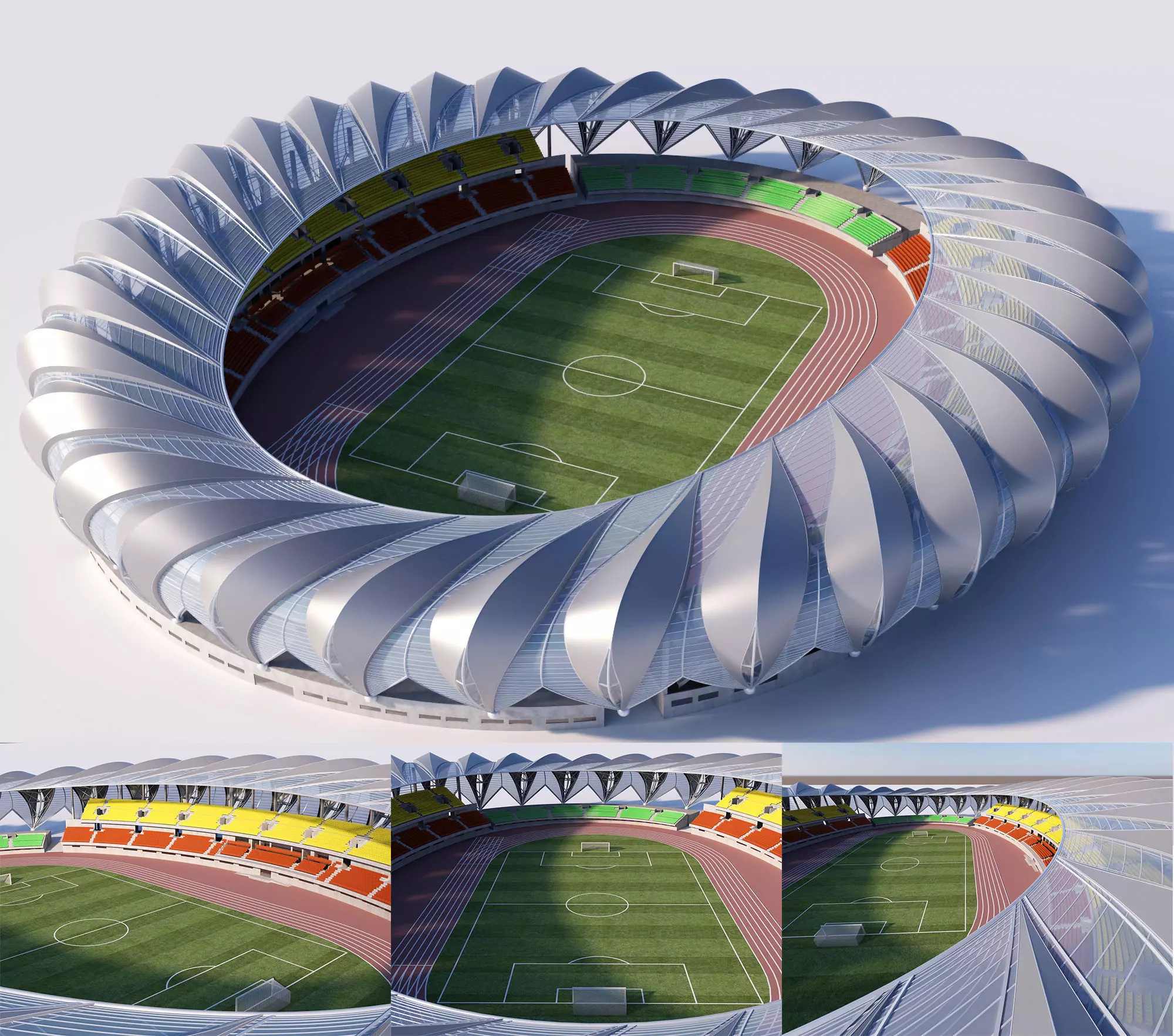 Professional high-quality 3D model of a Modern Parametric Sports Stadium meticulously crafted for large-scale architectural visualization and urban landmark projects. This impressive asset features a unique petal-shaped organic roof structure detailed spectator seating areas with multi-colored sections a professional football pitch with realistic grass textures and a complete running track system.