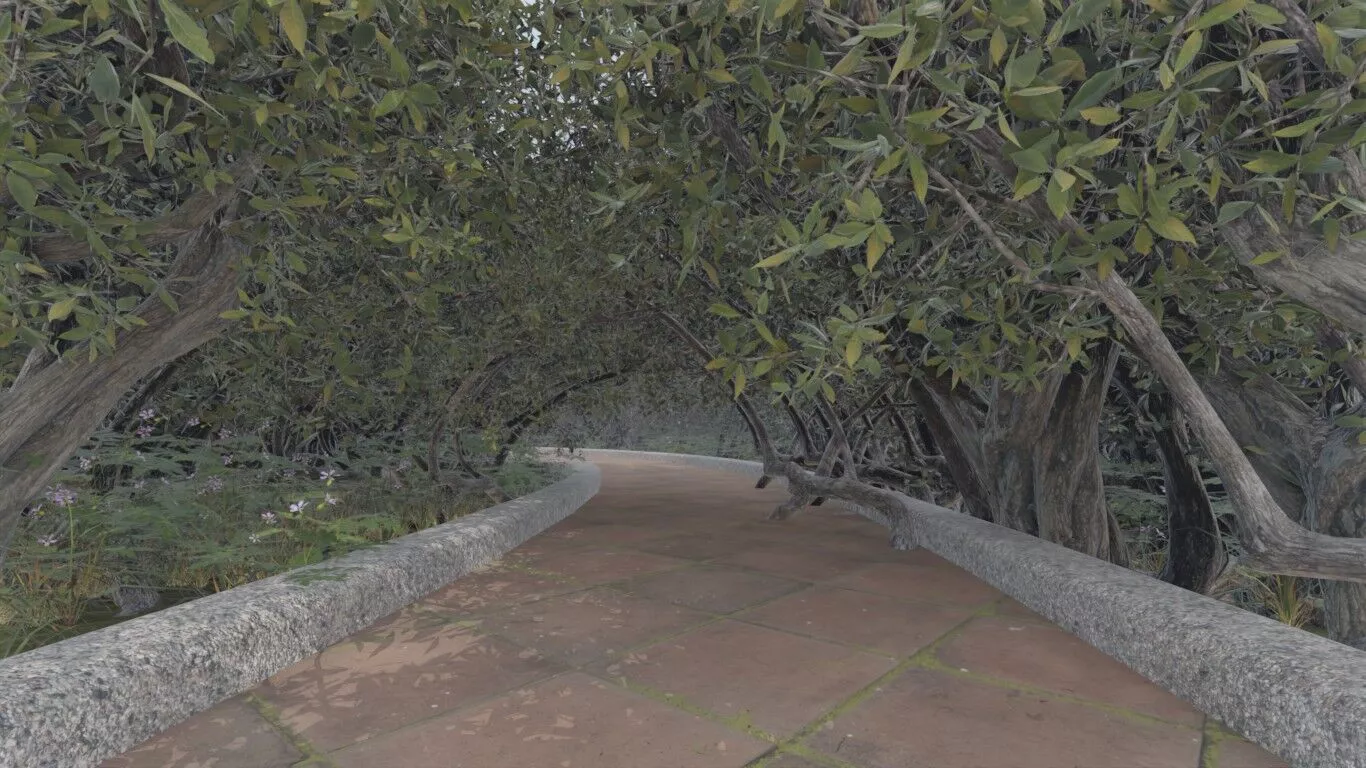 Filled with temple complex, stone pathway, arched tree canopy, domed buildings, the environment rewards closer inspection with touches like foggy aerial view, curving tiled walkway, low stone borders, overgrown branches crossing the path. Ready for game engines, real-time rendering, and enterprise AI pipelines building synthetic environment datasets.