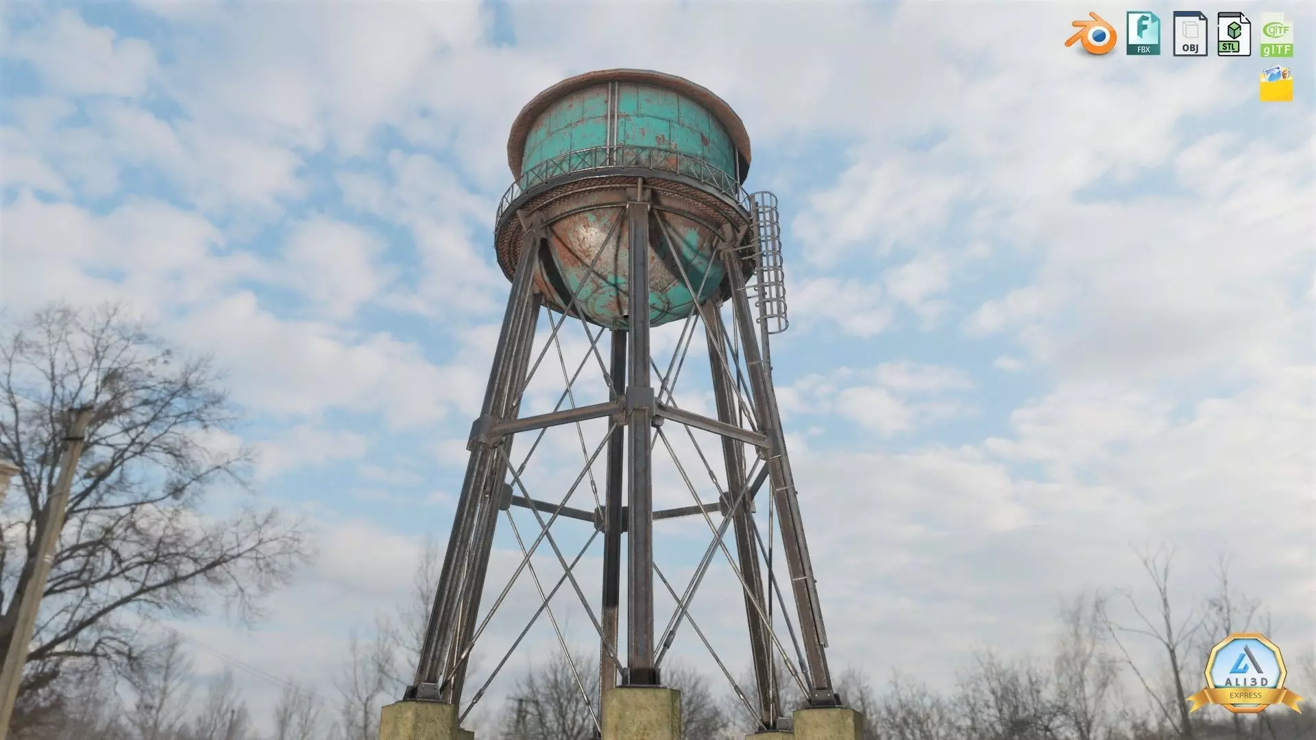 The 3D model depicts an old, rusty water tank tower standing tall against the backdrop of an urban or rural landscape. The tower's weathered appearance gives it a distinct character, evoking a sense of history and nostalgia.