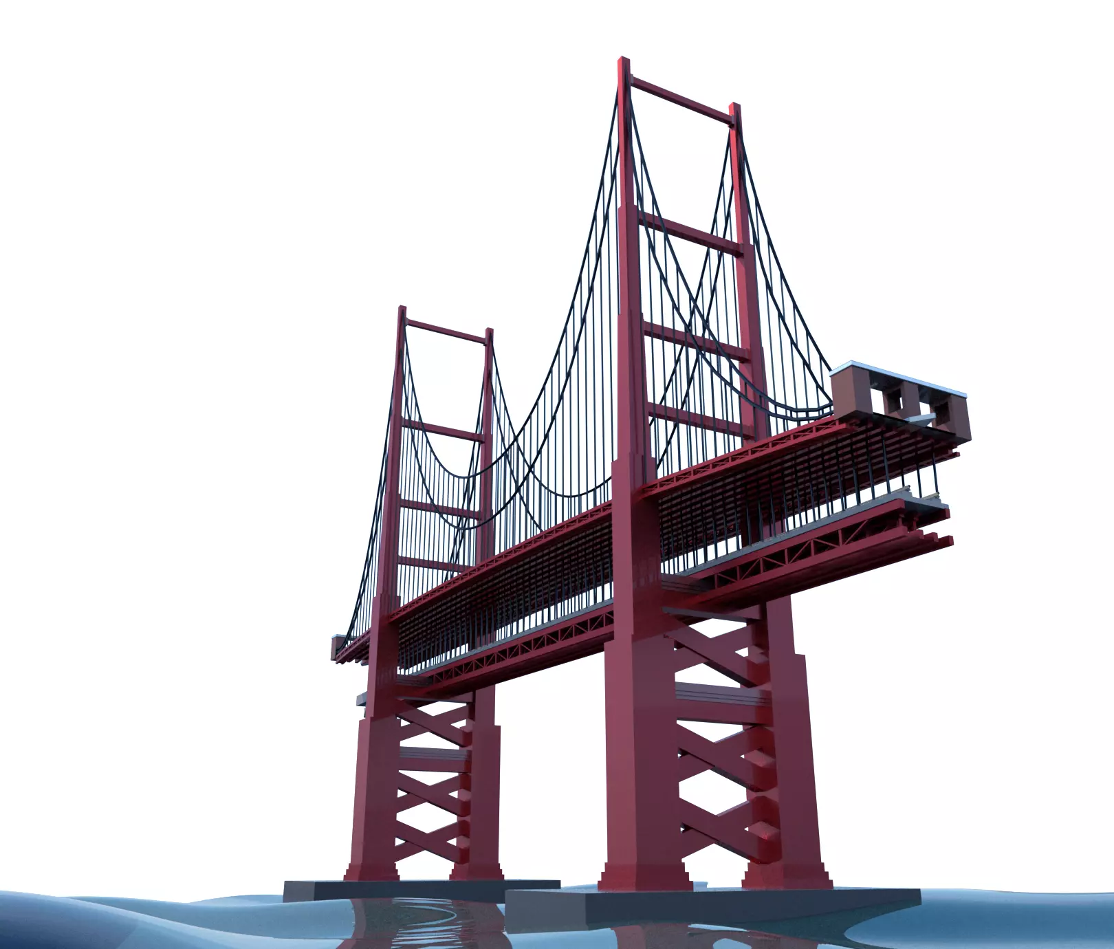 This low poly suspension bridge is based on the world-famous magnificent Golden Gate Bridge in San Francisco, California. You can see how it has inspired by the design with the massive red supports. It is a double-layered bridge with the highway on the top and a railway/ tramway running underneath the highway section of the bridge.