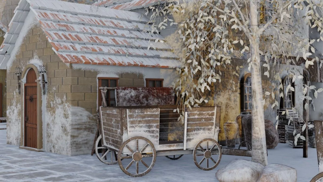 Filled with stone houses, fortress walls, courtyard, watchtower, the environment rewards closer inspection with touches like snow-dusted rooftops, frosted barrels, arched wooden doors, stone staircases. A strong asset for period game environments, cinematic world-building, or AI training datasets requiring authentic cultural and architectural variety.