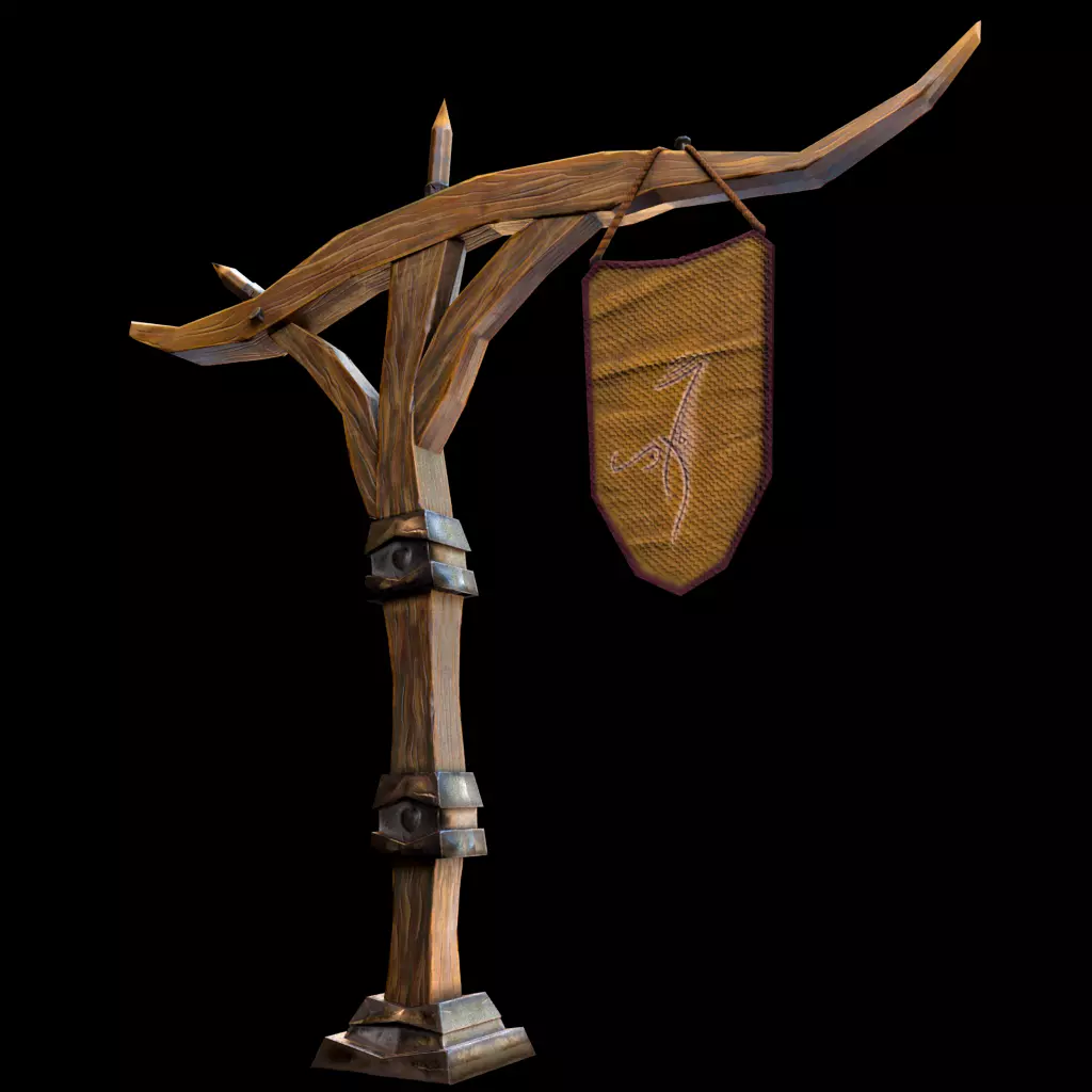 Wooden pillar with banner Low-poly 3D model