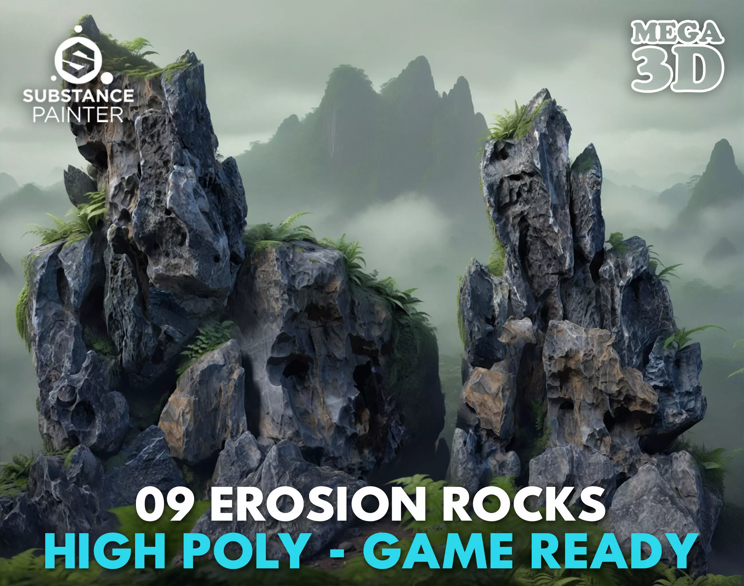 This product includes 9 3D models of eroded stone. The black stone material is mixed with white vein lines. The eroded surface forms various bumps and dents. You can adjust the model size by scaling, rotating, flipping, and combining them to create a variety of models for your scene as you wish.