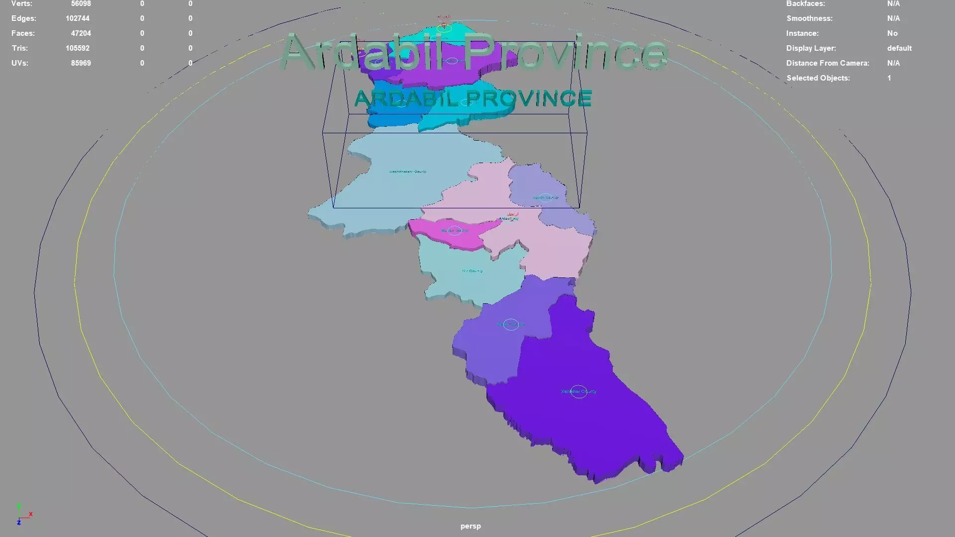 Ardabil Province regions : The model is divided according to the administrative region of Ardabil Province. Each region is clearly separated so you can easily isolate it or change the colors. Names are also editable and separate.
